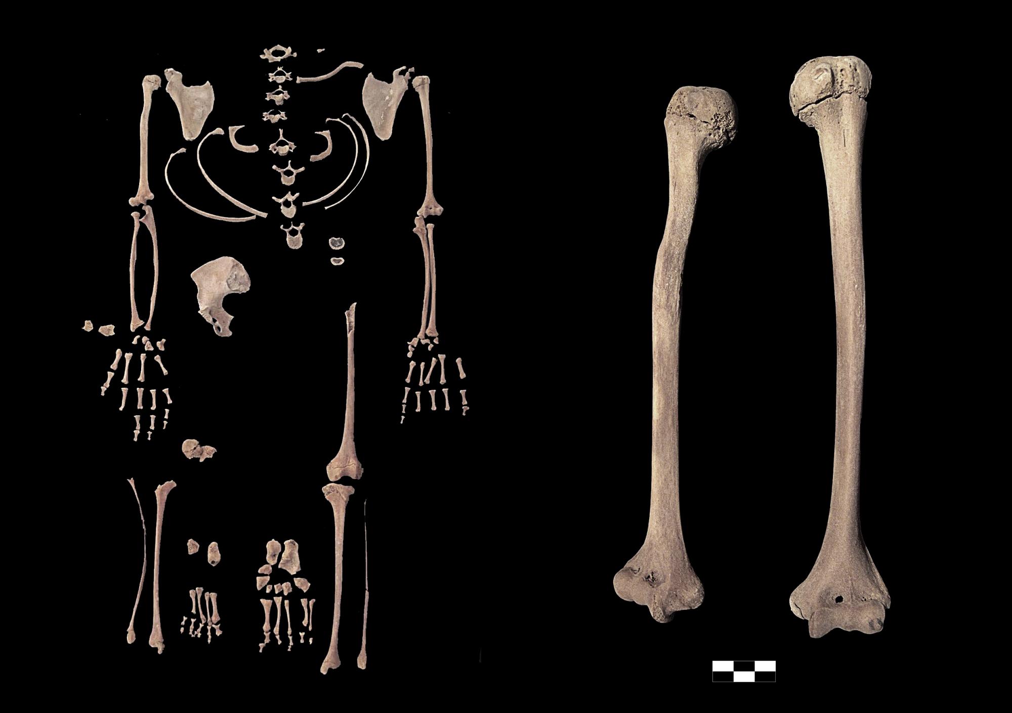 Ilyen mértékű bolygatás esetén ritkán lehet az egy egyénhez tartozó maradványokat összeválogatni, de épp a csontokon megfigyelt patológiai eltérések, ebben az esetben ezt lehetővé tette. A fenti kép bal oldalán a kórosan rövid jobb combcsont a látható. A kb. 40 évnél idősebb nő medencéjéhez és alsó végtagjaihoz tatozó csontokat találtuk meg. A csontok méretei leginkább egy kb. 9-11 éves gyermek méreteinek feleltek meg. A jobb sípcsont teljes hosszából becsült testmagasság ugyanis mindössze 130,6 cm volt. A törpenövés azon példája ez az eset, amikor a növekedés, hormonzavar következtében ideje előtt leáll és ez által, bár arányainak megfelelő a test, de igen kis növésű marad. A betegség lehet örökletes, de koponyán belüli daganatok, gyulladások is kiválthatják a hipofízisben termelődő növekedési hormon elválasztásának károsodását.