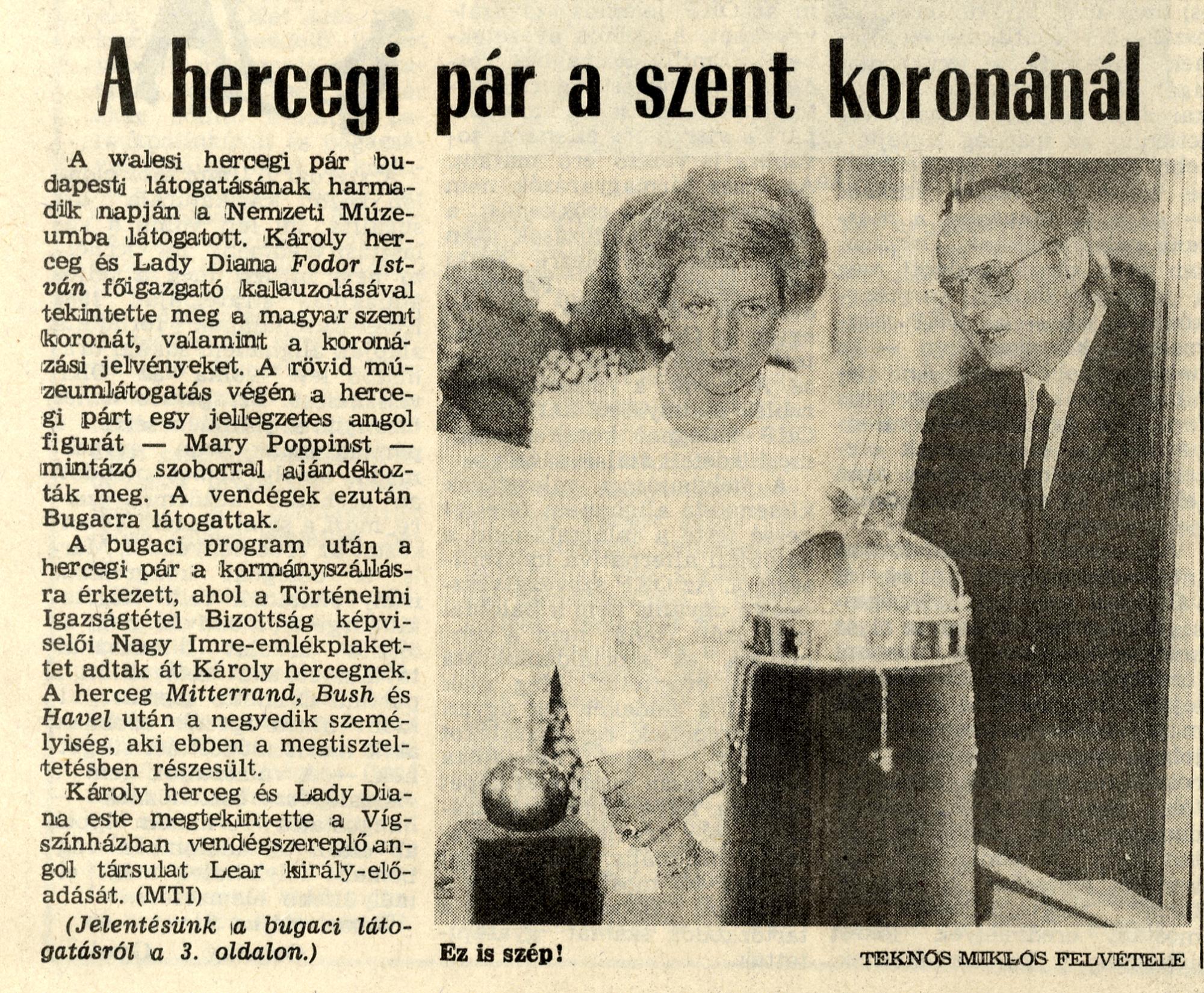 A koronázási jelvények megtekintéséhez csak néhány lépést kellett megtennie Károlynak és Dianának, mert 1978 óta, amikor Magyarország visszakapta az Egyesült Államoktól a jelvény együttest, az első emeleti ún. Korona-teremben őriztük őket. Ott, ahol Szent István palástja ma is megtekinthető. A hercegi pár nagy érdeklődéssel hallgatta Fodor főigazgatót, akinek hivatali idejében még az is megadatott, hogy három évvel később II. Erzsébet angol királynőnek is bemutathassa a Szent Koronát és a magyar koronázási jelvényeket.