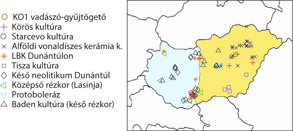 A Lipson M. & Szécsényi-Nagy A. et al. tanulmány 1b ábrája nyomán készült térkép bemutatja az elemzett Magyarországi minták származási helyét. A minták régészeti kultúrák-korszakok szerint csoportosítottak. http://dx.doi.org/10.1038/nature24476