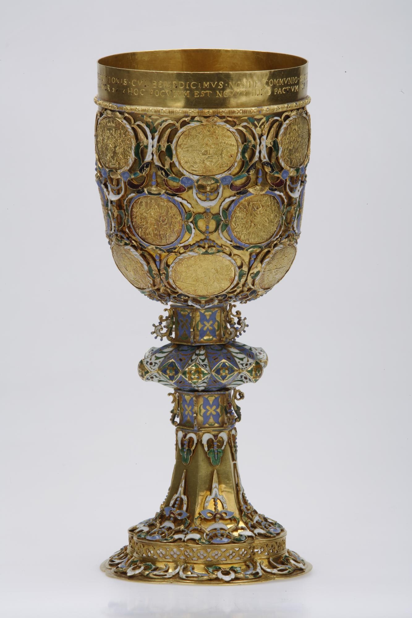 A képen látható úrvacsora-kehely 18 domborított medalionja a Passió eseményeit beszéli el, közöttük a lábmosás viszonylag ritkán ábrázolt jelenetével. A medalionokat a teljes felületet beborító zománcozott háló kereteli. A kehely szájpereme alatt az úrvacsorára, a Krisztus vérében való közösségre utaló idézet olvasható Pálnak a korinthusiakhoz írott első leveléből (1Kor 10,16) és Máté evangéliumából (Mt 26,27).