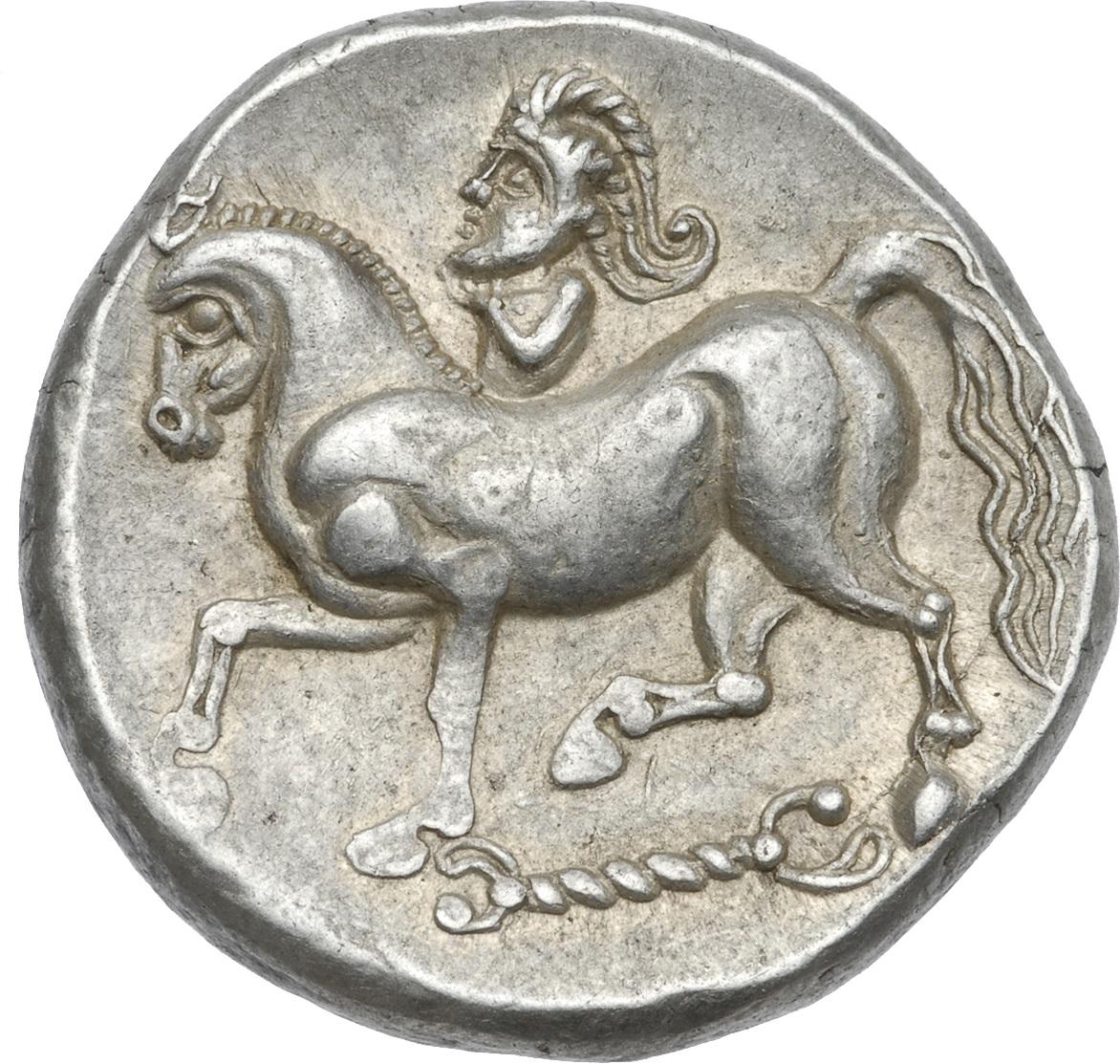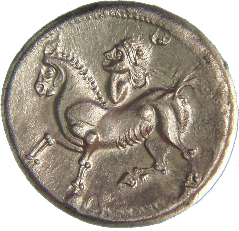 Az előlapon egy szakállatlan, gyöngydiadémot viselő, jobbra néző férfifej látható, a szebben kidolgozott példányokon szinte portrészerűen karakteres vonásokkal. A hátlapon pedig egy balra haladó ló, melynek lovasát lényegében csak egy leegyszerűsített törzsből kinövő emberfej jelzi. A meglehetősen kevés – különösen ismert lelőhelyről – fennmaradt példány a keleti kelta pénzverés egyik legizgalmasabb csoportjához tartozik, amely átmenetet képez a makedon király, II. Philippos (Kr.e. 359–336) tetradrachmáit utánzó Kárpát-medencei éremverések és a mai Ausztria, Szlovénia területének Itália, sőt már Róma által is befolyásolt éremverései között. A Dorotheum árverésén megvett példány esetében viszont egy eddig ismeretlen, új előlap tartozik a már ismert hátlapi lovashoz. Ez esetben is egy nagyon karakteres, de balra néző, diadém nélküli férfifej látható az érmén, amelynek előzményei talán a hellénisztikus Egyiptomban uralkodó Ptolemaida dinasztia pénzei lehettek.