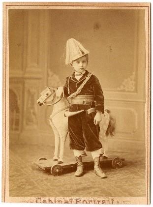 Komoly, ábrándos arcú kisfiú néz ránk egy barokk enteriőrt mímelő műtermi háttér előtt. Fején sisak, ünneplő bársony öltönyének övében balta, vállán átvetve „mászó-készület”, jelzősíp, kürt: apró tűzoltó-felszerelés. A kerekes lovacskával együtt, melyre minden bizonnyal a fotográfus instrukcióinak megfelelően könnyedén támaszkodik, valószínűleg egy boldog karácsony vágyott ajándékai. Otthon, a gyertyafényes karácsonyfa mellett ekkor még nem készülhettek fotográfiák. Gyaníthatóan az egész család elzarándokolt a festőből fényképésszé lett Doctor Albert Erzsébet téri műtermébe, és nem kis büszkeséggel szemlélte a háromlábú „csodaágyú”, a fényképező kamera mögül a megilletődött, leendő kis hőst új kincseivel. Az ajándékok valószínűleg Brunner „Gyermekédenéből” kerültek a fa alá, aki 1875 decemberében kezdte hirdetni Fröbel-féle játékait a Fővárosi Lapokban. A játéknak a gyermek személyiségfejlődésére gyakorolt hatását hirdető német pedagógus, Friedrich Fröbel tanai, játék-és foglalkoztatási eszközei az 1860-as évektől kezdtek szélesebb körben ismertté válni Magyarországon. 1871-ben már a nevét viselő szaklapot adott ki a Budapesti Fröbel-nőegylet. Brunner boltjában, a pesti gyermekek Mekkájában kislányok számára bábuk, edények, főzőkályhák, bútorok, porcelán- és fém-asztalkészletek és sok hasznos kézimunka sorakozott a polcokon, fiúk számára pedig állatok, katonák, házak, kockajátékok, színházak, laterna-magica, bűvészkészlet, festék-, író- és rajzeszközök, asztalosszerszámok, fűrészmunkák, katonai felszerelések és végül, de nem utolsó sorban, vadász-, posta-, huszár- és tűzoltó-garnitúra.