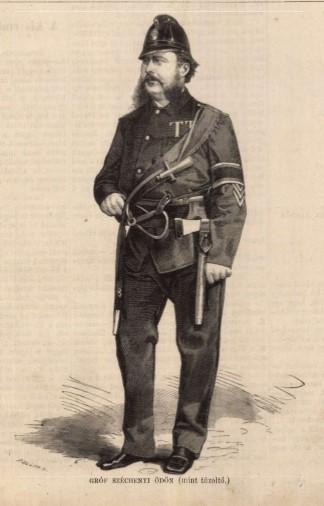Széchenyi Ödön gróf tűzoltó egyenruhájában, zubbonyán a TT „Tornász-tűzoltó” emblémával, 1870.