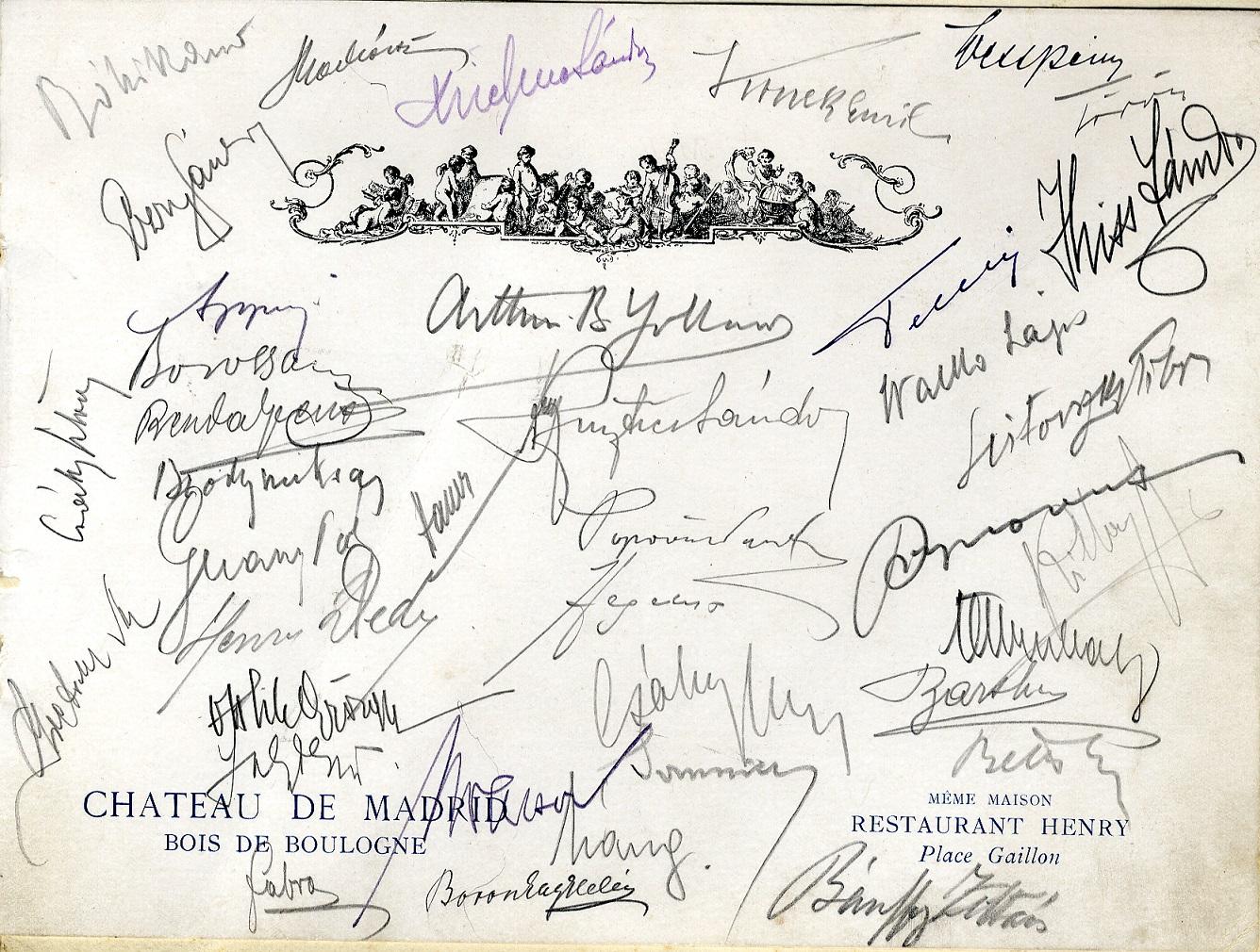A szálloda éttermének díszes borítóval ellátott menü-kártyája két lapból áll, az egyiken a Château de Madrid képe látható egy régi metszetről (a kastély a 16. századi reneszánsz építészet egyik híres alkotása volt), a másikon a „Menu” felirat olvasható, de az ételválaszték nincs beleírva (feltehetően egy külön lapon szerepelt). Ennek a másik oldalán találhatók az aláírások, amiket Győrffy István az ebédek, vagy vacsorák szünetében, mintegy emlékkönyvszerűen összegyűjtött. Összesen 38 név szerepel a lapon. Köztük van az elnök Apponyi és a főmegbízottak közül Teleki Pál, Popovics Sándor és Somssich László aláírása. A megbízottak közül szinte mindenki aláírta: Walko Lajos, Bartha Richárd, Csáky Imre, Láng Boldizsár és Konek Emil. A főtitkárságtól Hauer konzul névjegye található a lapon, a tíz titkár közül pedig nyolcé. Az újságírók közül Fabro Henriké, Ottlik Györgyé és Benda Jenőé. Még a titkárnők egyike, Boronkay Helén is aláírta. A Magyar Nemzeti Múzeum Történeti Tárának Nyomtatvány Gyűjteményében őrzött autogramgyűjtemény, egyike a legközvetlenebbül Trianonhoz kapcsolódó múzeumi emlékeinknek.