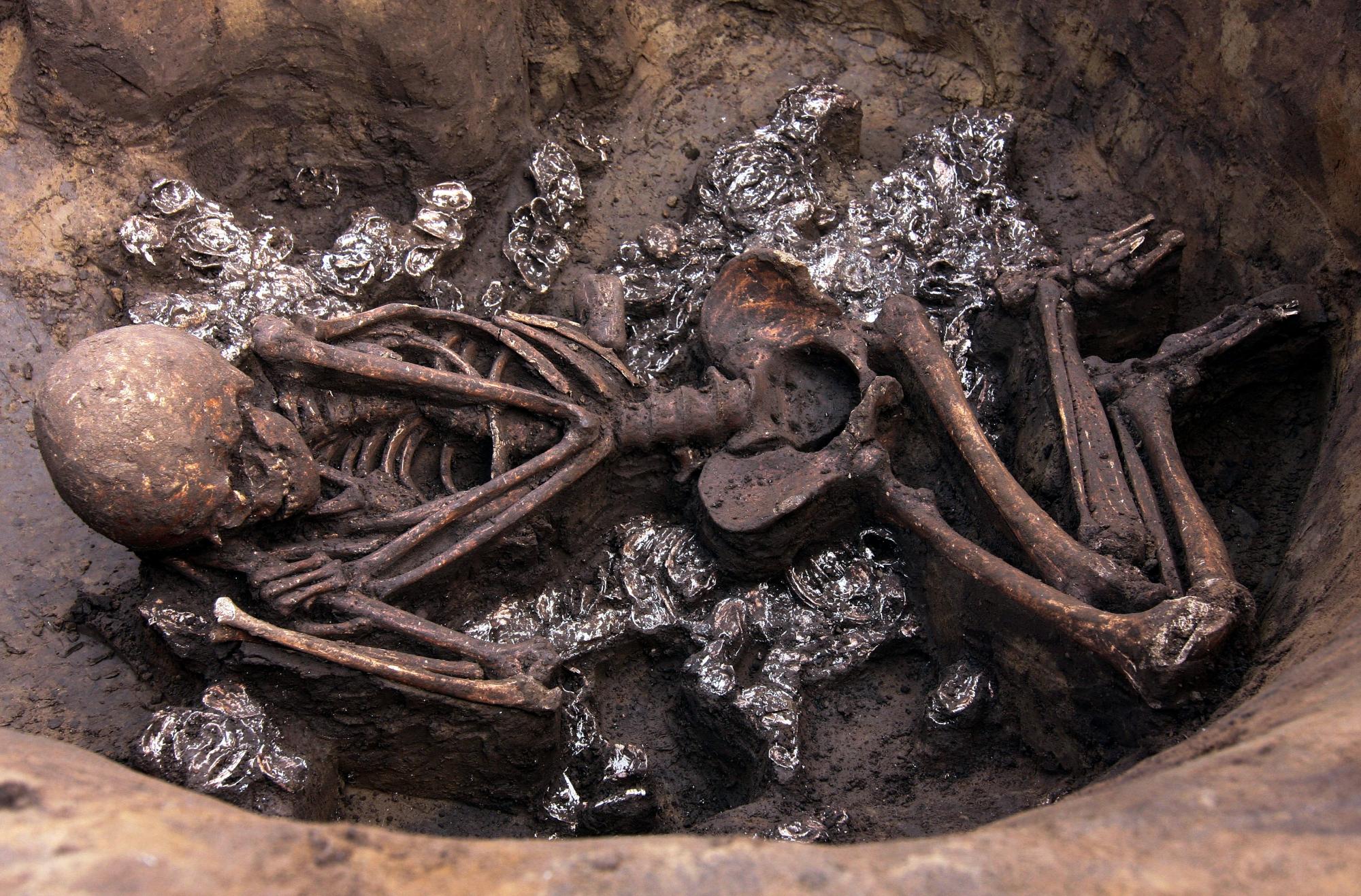 Kép: A halottat zsugorítva helyezték a sírba, jobb keze a feje alatt van, bal kezét a jobb vállára rakták, alvópózban helyezték örök nyugovóra.