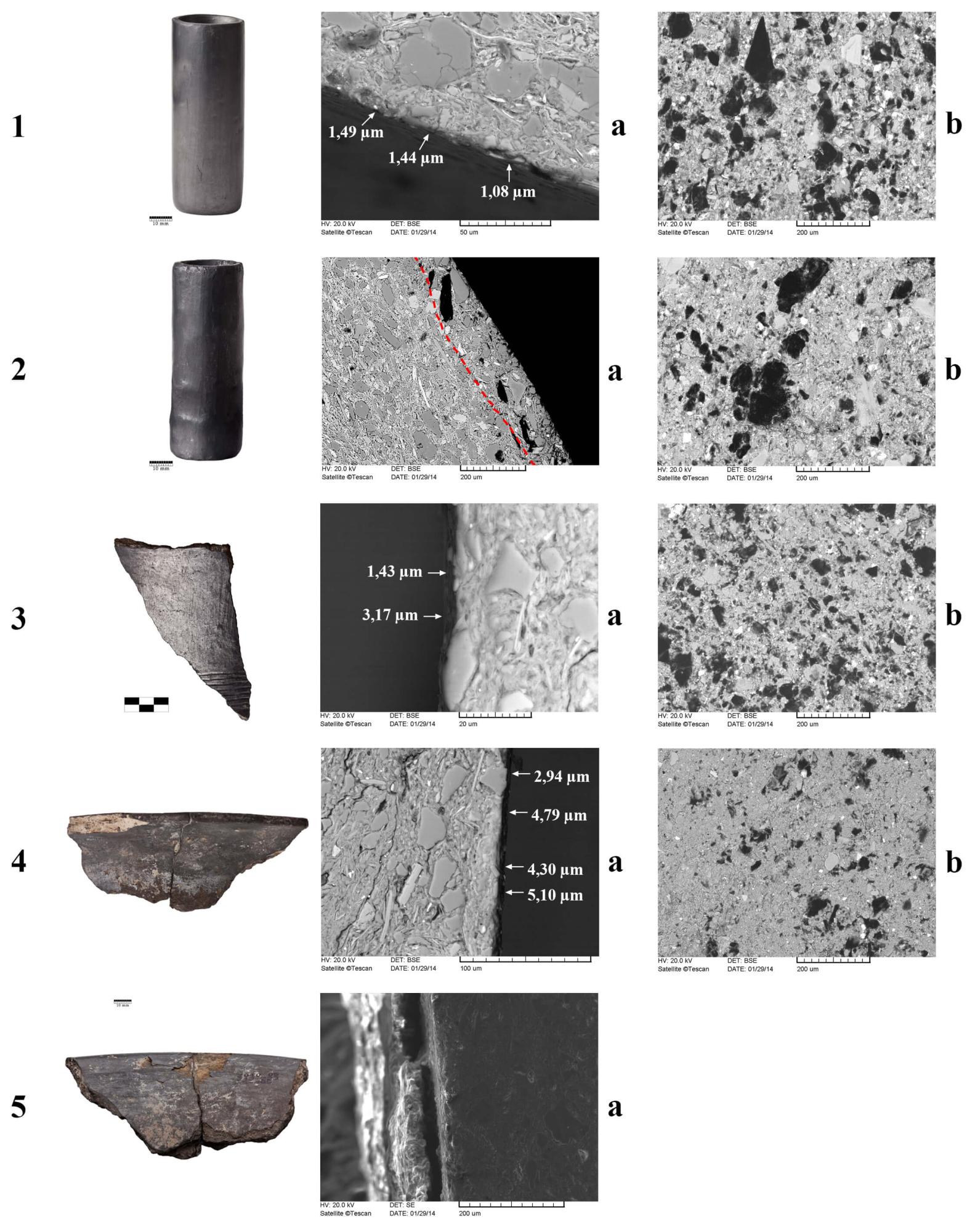 Kép: A kísérleti minták (1–2) és a tiszaburai régészeti kerámiák (3–5) grafitbevonatának pásztázó elektronmikroszkópos képe. A kísérletünk során létrehozott grafitos bevonat eloszlása és vastagsága nagyon hasonló a régészeti kerámiákon tapasztaltakhoz.