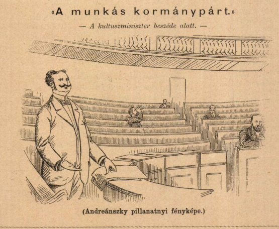 Wlassics Gyula báró, vallás- és közoktatásügyi miniszter beszél a kultusztárca január végi költségvetési vitáján. „Andreánszky Gábor fotográfiát csinált a kormánypárt padjairól, amelyekben csak hárman ültek, ezzel a fölírással: a szabadelvű párt támogatja Wlassics minisztert” – számolt be az esetről a Budapesti Hírlap, 1895. 29. száma. A fényképből az ellenzéki - Függetlenségi Párti- élclap rajzoltatott karikatúrát (Bolond Istók, 1895. 6. szám)