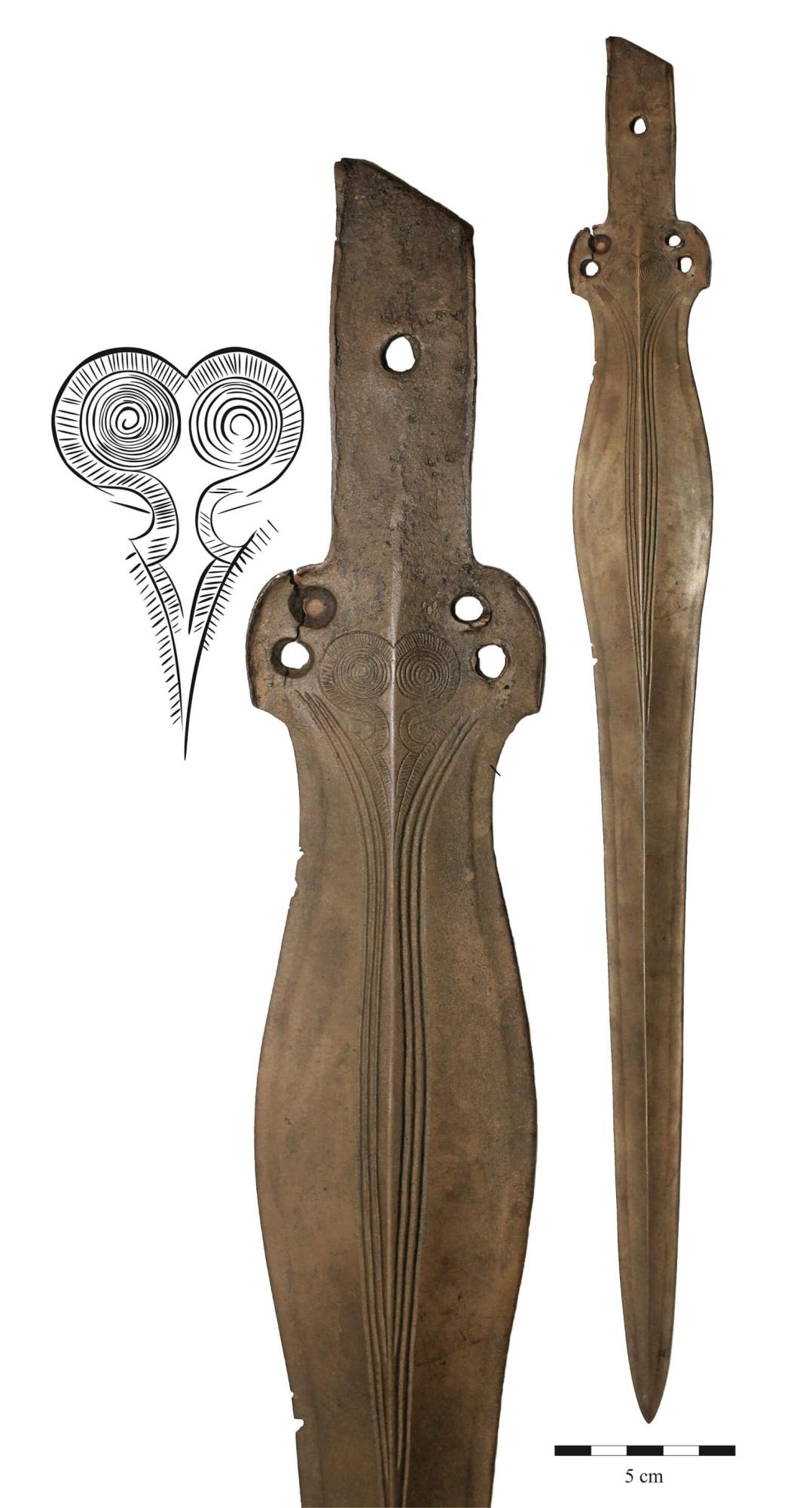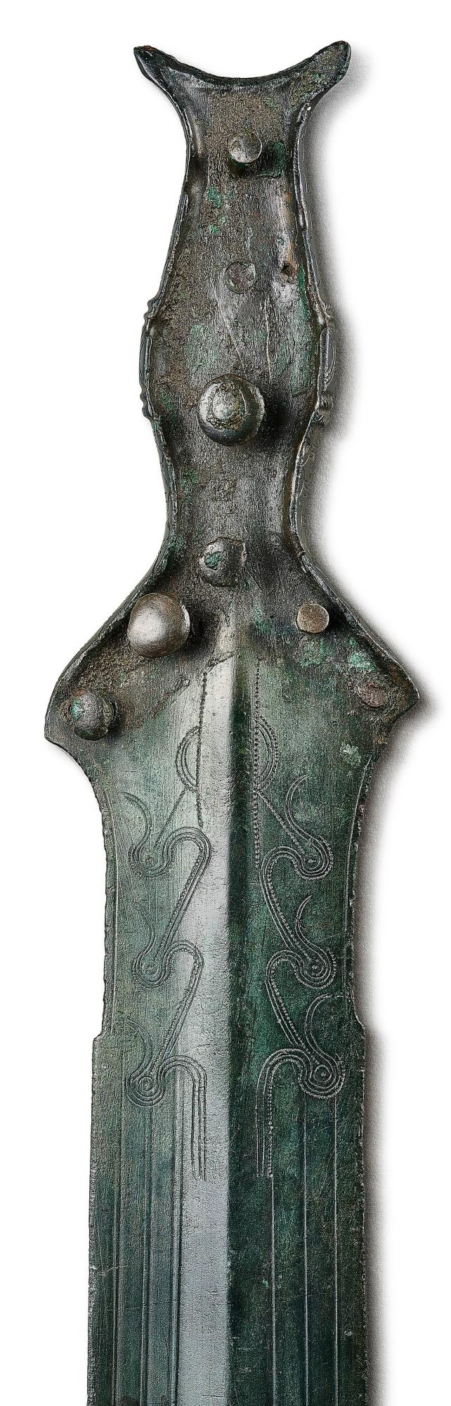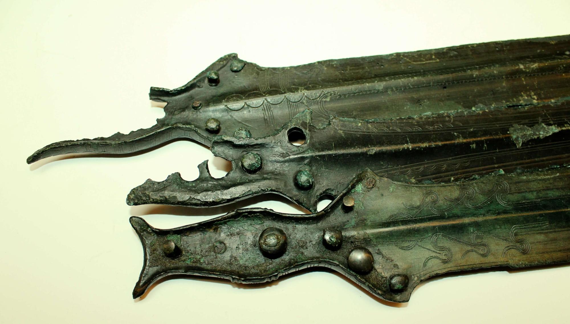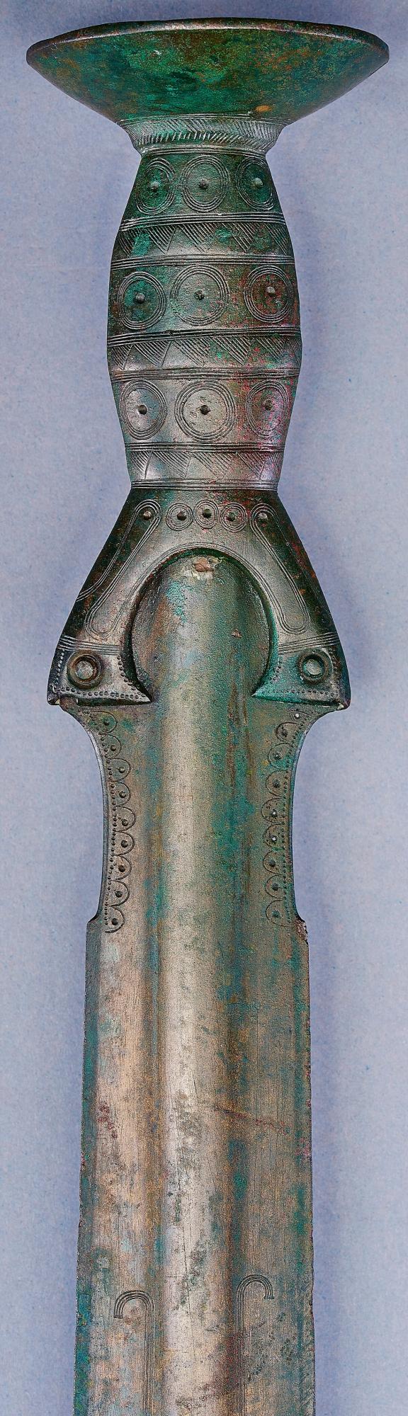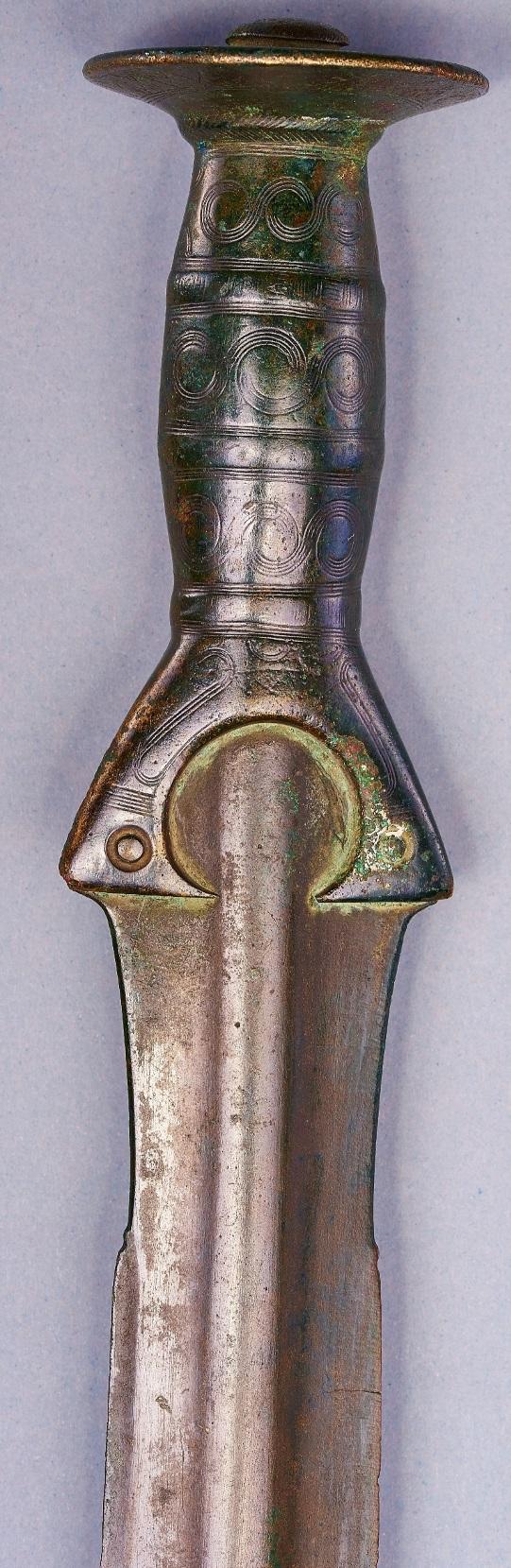 Kép: Nyélnyújtványos kard Munkács-Őrhegyaljáról (Mukachevo-Pidhorjany). Az egykori, valószínűleg fa markolat lenyomata még mindig jól látható a fegyveren. Késő bronzkor (Kr.e. 1000-900) (Fotó: Vágó Ádám)