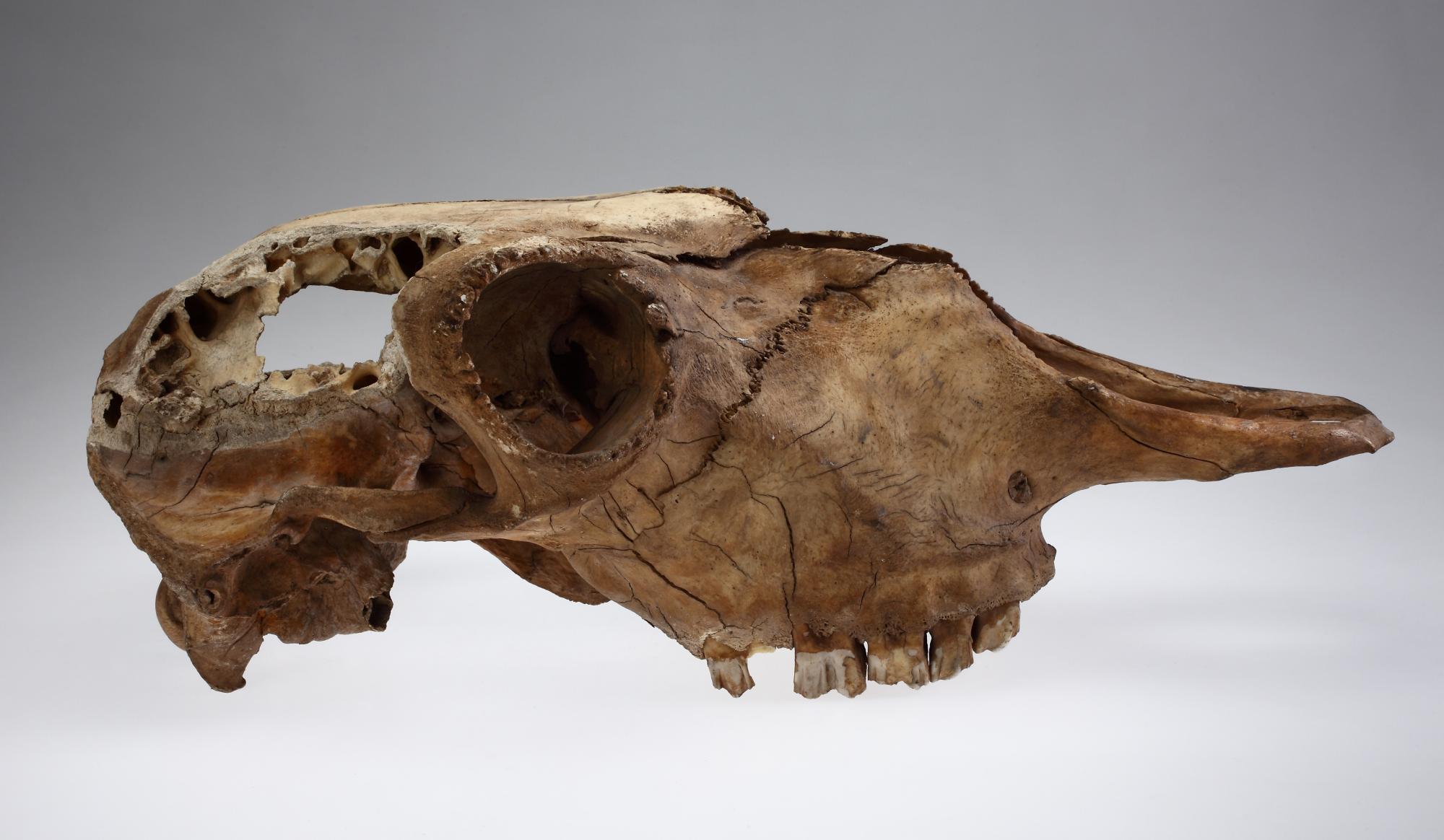 A képen látható bölénykoponya Erdélyből, Krassó-Szörény megyéből származik és a 11–13. századra keltezhető. 1911-ben a Szörényi-Érchegységben, Aninától délre, a pauleászkai erdőben kíváncsi és bátor vállalkozók egy nagyméretű barlangot jártak be, amelyet később Böckh János geológusról neveztek el. A Magyar Királyi és Földtani Intézet a barlang és a leletek megtekintésére Kormos Tivadar régész–paleontológust küldte ki. A barlangban több más állatfaj –részben cseppkővel borított– maradványaival együtt a főcsarnokban egy fiatal medve csontváza közelében egy bölény teljes csontvázát találták meg. A medve mellett egy cseppkőbe ágyazódott, 12–13. századinak meghatározott nyílhegy feküdt, míg a bölény korát a csontok cseppkőbekérgezése alapján ennél néhány száz évvel idősebbnek becsülték. Az elejtés során az állat mindkét szarvát levágták, középkori szokás szerint ivókupát, serleget vagy kürtöt készíthettek belőle. A bölény csontvázát a Magyar Királyi és Földtani Intézetbe szállították, itt 1935 tavaszán Háborl Viktor preparátor és Mottl Mária paleontológus állította fel. A középkori, bölénytehén erdélyi csontváza lett a Kretzoi-féle magyar bölény típuspéldánya (holotípusa). A csontváz 1956-ban nagymértékben megrongálódott, a koponya jelenleg a Magyar Nemzeti Múzeum Állandó Kiállításán látható.