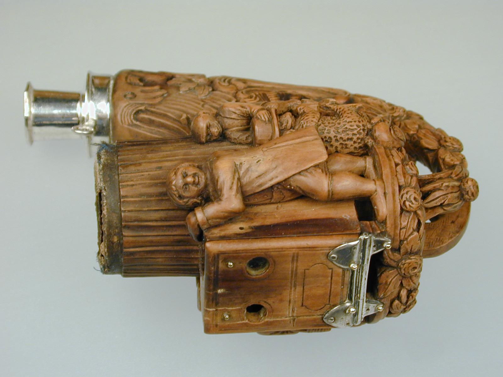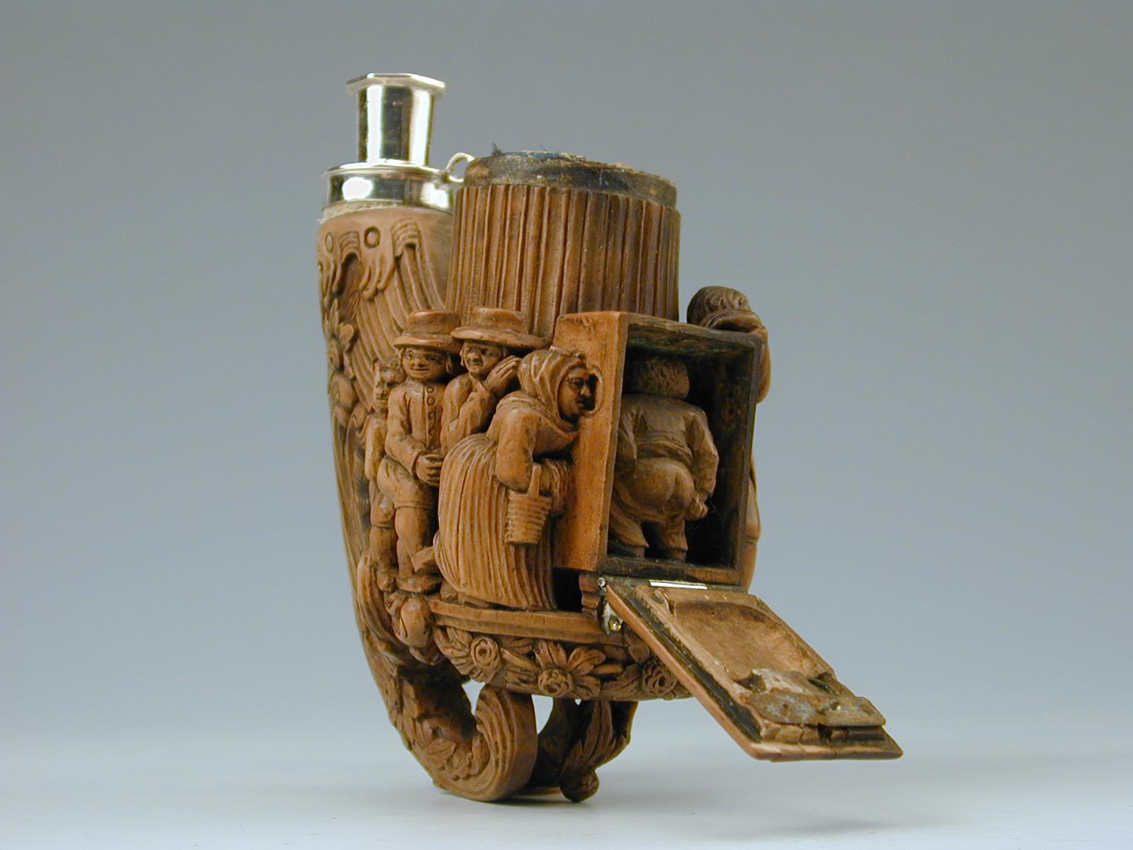 De térjünk immár rá a Nemzeti Múzeum tárgyának bemutatására, amely a fentebbi gondolatokat elindította. Magas színvonalú, elegáns kivitel jellemzi a különös témájú pipafejet (Ltsz. 1974.262, német, XVIII. sz. vége, XIX. sz. eleje, M: 10 cm, H: 13 cm). Az ulmi pipaformára emlékeztető lapított nyak és talprész különleges áttört faragású, könnyed virágos rokokó motívumokkal díszes. A levelek kannelúrás mintázatú oszlopos kazánt tartanak, amelyet magasfaragású, vaskos humorú figurális jelenet vesz körbe. A vásári mutatványos kukucskálós bódéja, amolyan XVIII. századi „popsi-peepshow". A lábakon álló szekrény kerek ablakocskái előtt tolong a nép. A termetes asszonyság éppen kíváncsian benéz a nyíláson, mögötte két kalapos férfi és egy suhanc várja, hogy sorra kerülhessen. A fülke ajtaja ezüst zsanérokon lenyitható, belül egy legény letolt gatyával hátsó felét mutatja a közönségnek. A mutatványos mögött egy kalapos ülő kutya és felöltöztetett majom szolgál további látványosságként. A pipa kupakja és kupakpereme hiányzik. A pipanyak végén az ezüst keretelés kiemelkedő pipaszártartó csőben végződik. Ha belegondolunk, ebből a pipából illatos pipafüst felhőket lehetett eregetni.