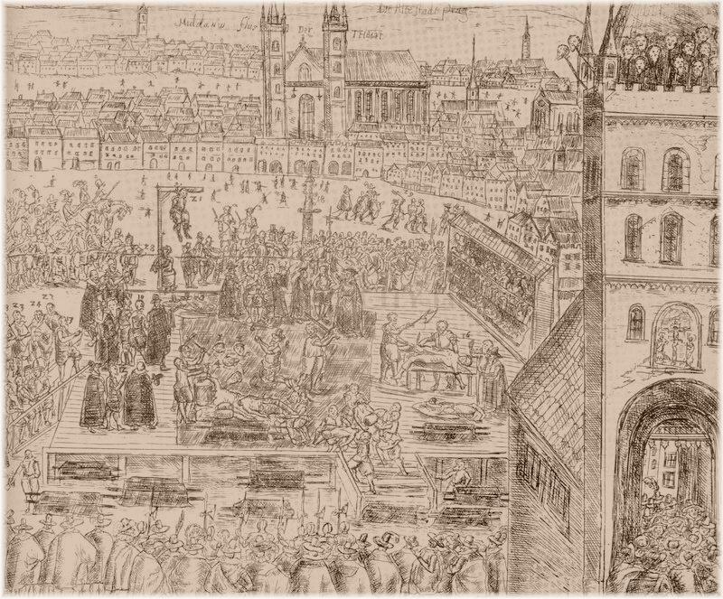 Rézmetszet a protestáns cseh felkelők 1621. június 21-i prágai kivégzésének jelenetével (jobb szélen a Károly-híd tornyának párkányán a felkelők levágott fejei láthatóak) - FORRÁS