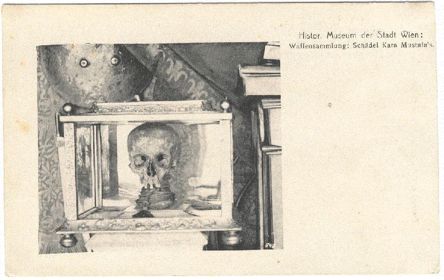 A bécsi várostörténeti múzeum (Historisches Museum der Stadt Wien) képeslapja Kara Musztafa török nagyvezír vitrinbe helyezett koponyájáról, 1900 k. - FORRÁS