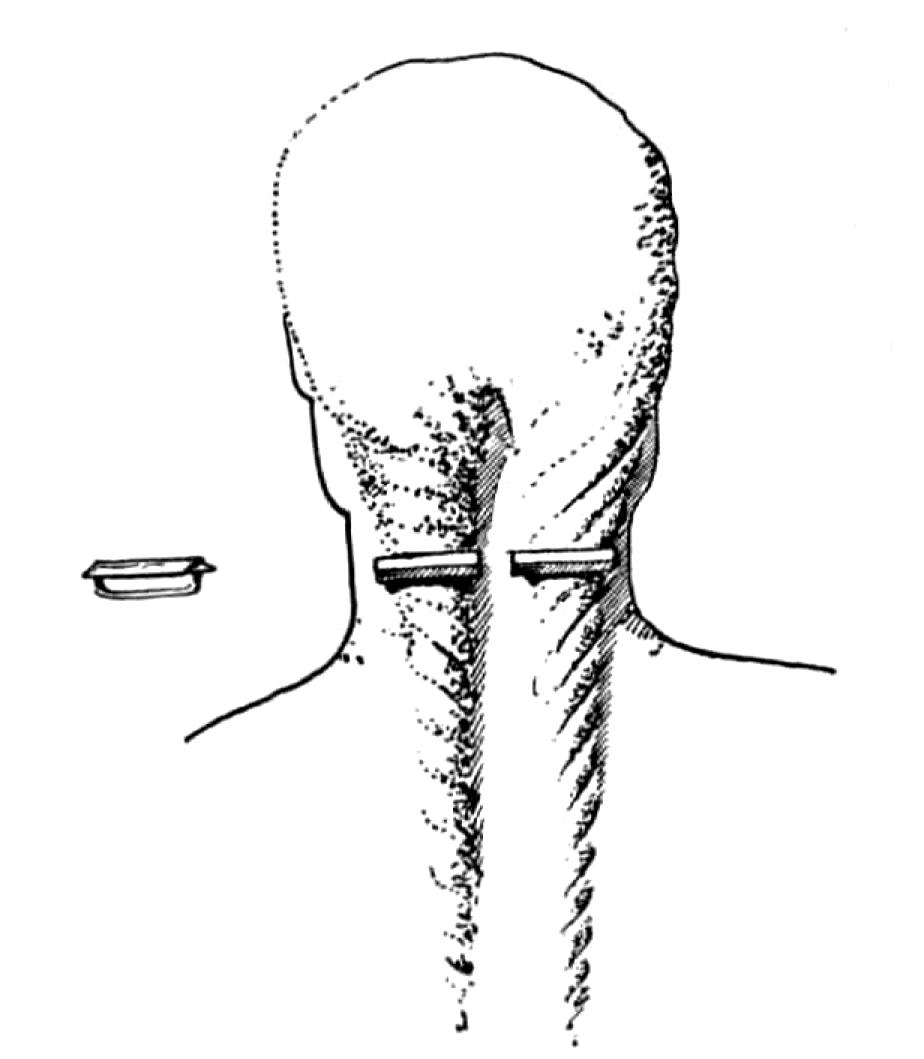 4. kép: Varkocsszorító viseletének rekonstrukciója. (Horváth Tibor: Az üllői és a kiskőrösi avar temető. Die avarischen Gräberfelder von Üllő und Kiskőrös. Archaeologia Hungarica XIX. Budapest 1935. nyomán)