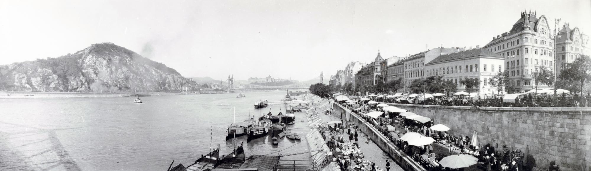 2. kép: A város gyomra: a Vásárcsarnokhoz tartozó Duna-parti idénypiac. Látkép a Ferenc József (ma Szabadság)-hídról. Balogh Rudolf panorámafelvétele, 1910-es évek eleje. Eredeti negatív, 29,7 × 8,5 cm, Magyar Nemzeti Múzeum Történeti Fényképtár, ltsz.: 79.819
