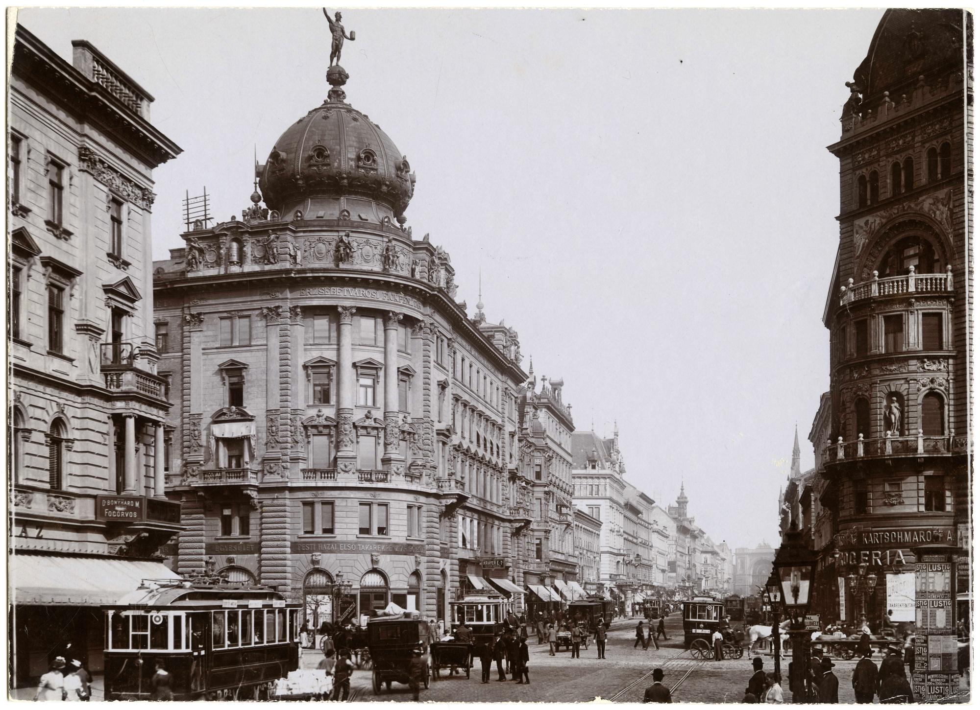 4. kép: Artériák: a Rákóczi út és a Nagykörút kereszteződése. A Divald és Monostory cég felvétele, 1906, celloidin, 21,5 × 15,5 cm, Magyar Nemzeti Múzeum Történeti Fényképtár, ltsz.: 83.1088
