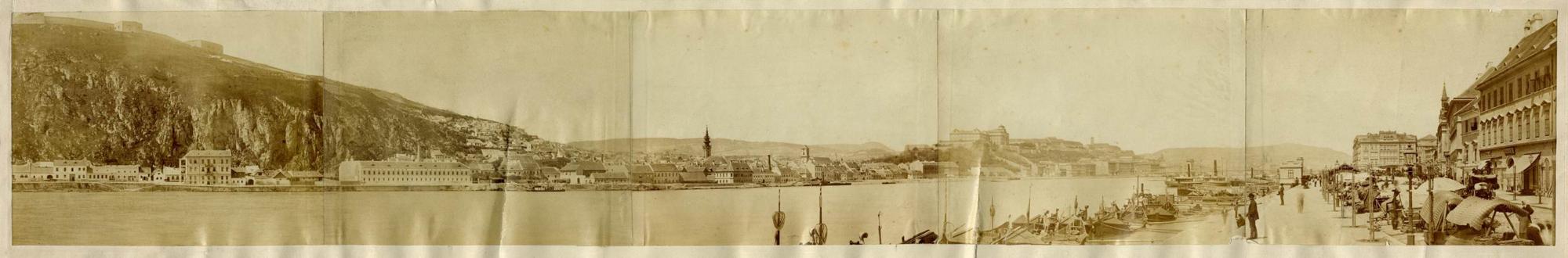 5. kép: Buda panorámája a Ferenc József (ma Belgrád) rakpartról. Jobbra a piaci sátrak mögött a belvárosi, egykori Hal teret határoló házak, a görög–macedón templom tornyai látszanak. Ismeretlen fényképész felvétele, 1875 körül, albumin, panorámakép, 13,7 × 10,5 × 5 cm, Magyar Nemzeti Múzeum Történeti Fényképtár, ltsz.: 110/1957 ​