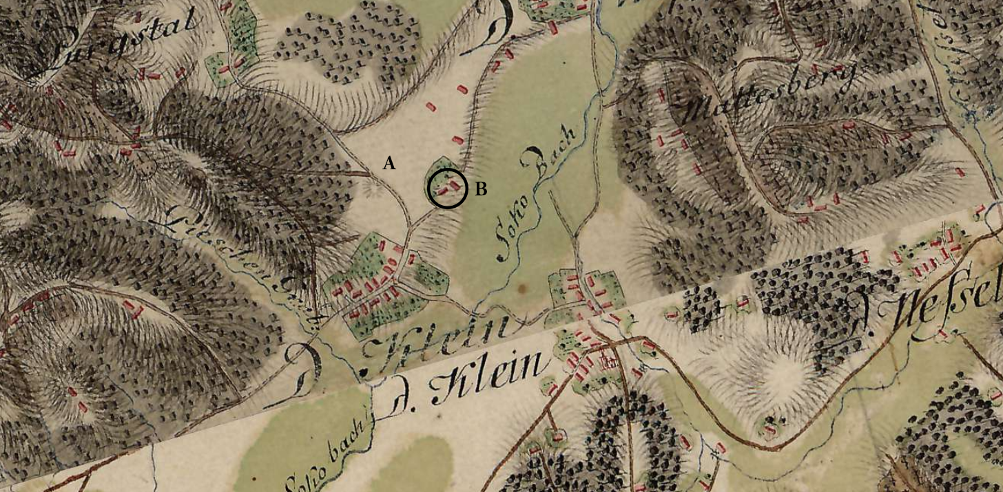 1. kép: Kleinklein a Habsburg Birodalom Első Katonai Felmérésének térképlapjain, a négy halom közül csak az ún. Pommerkogel egészen könnyen azonosítható (A). Bekarikázva a két Hartnermichelkogel helye (B).