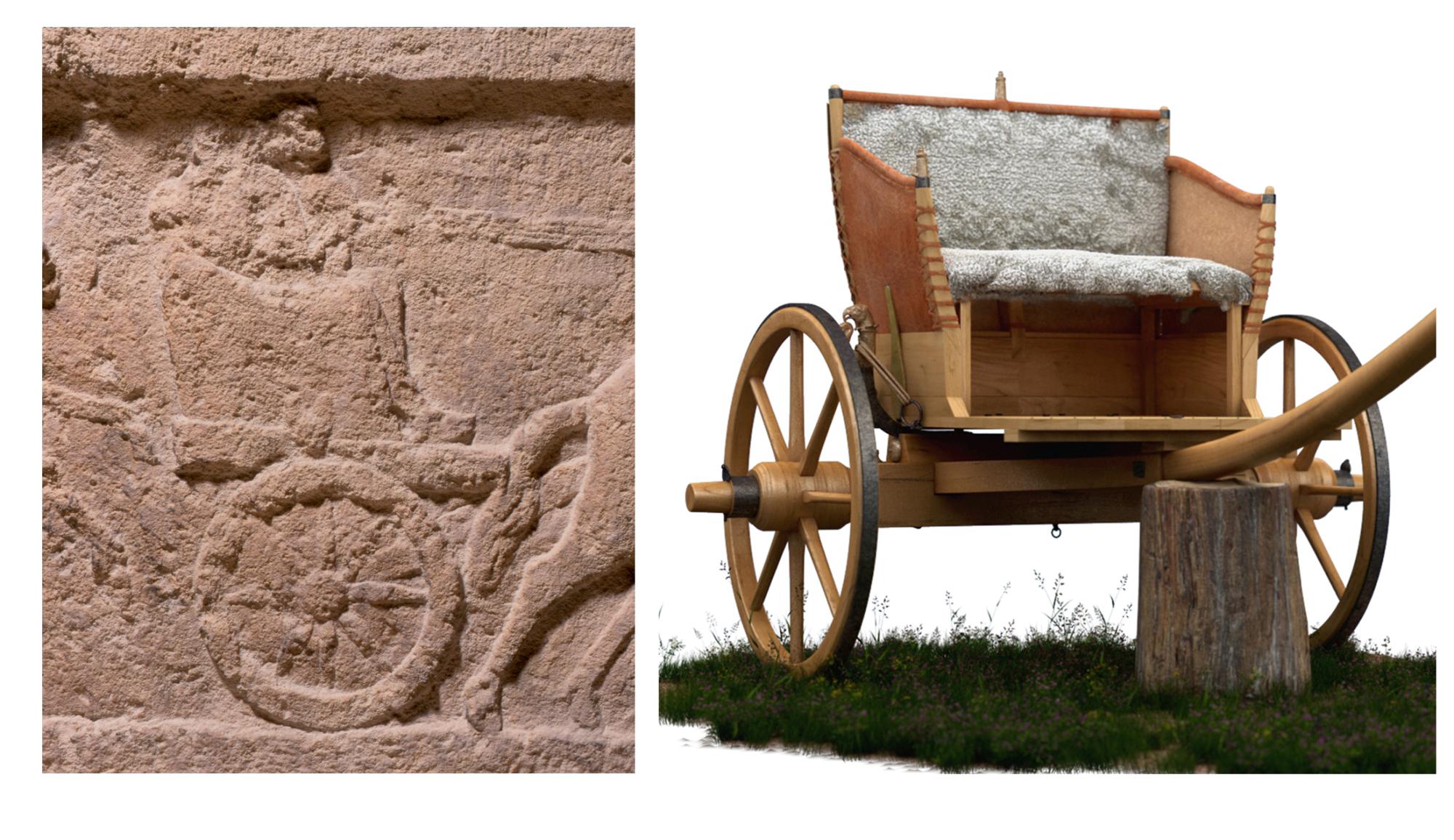 Kétkerekű utazókocsi ábrázolása egy Tökön talált síremléken és a budakeszi kocsi rekonstrukciója (rekonstrukció: Mráv Zsolt, 3D-grafika: Pazirik Kft.)