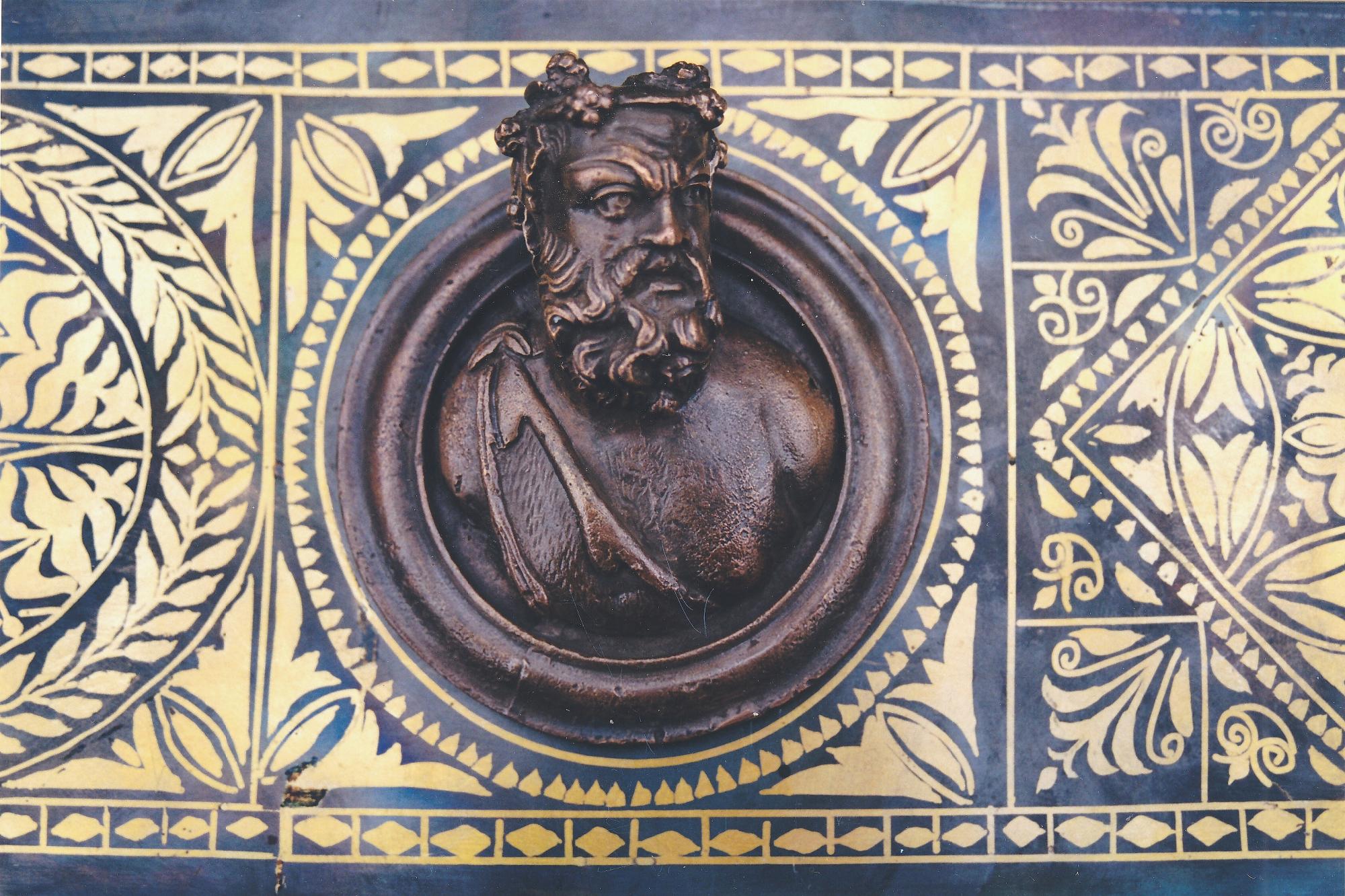A bölcs Szilénoszt ábrázoló díszítőbüszt a budakeszi kocsi hátoldaláról