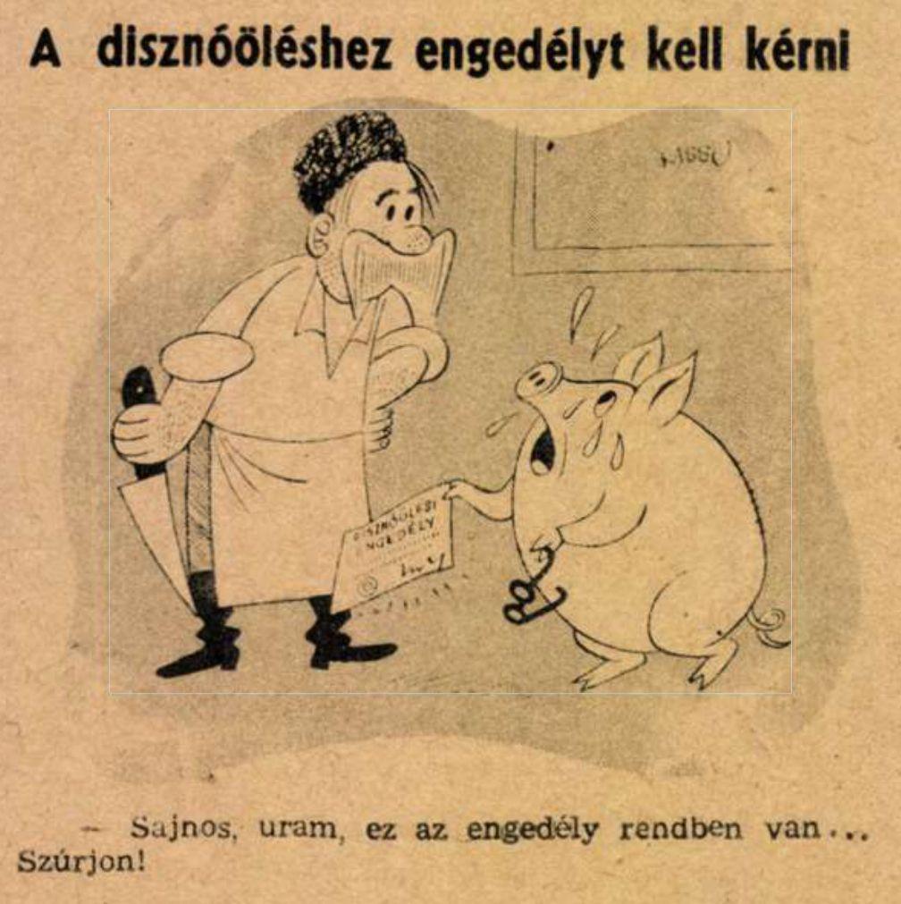 A disznóölési engedély bevezetésére reflektáló karikatúra a Ludas Matyi 1948. január 21-i számából. (Forrás: https://adtplus.arcanum.hu)