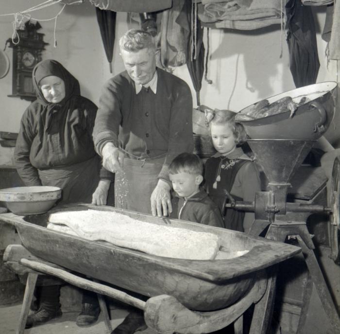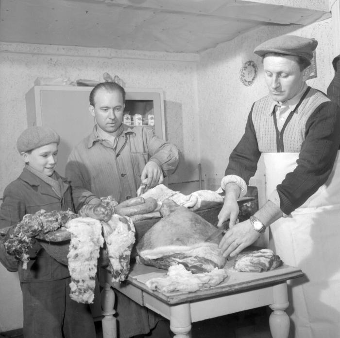 Készülnek a disznóságok Torma József cipész házában. Jobb szélen a böllér, balra a gazda fia, aki „a fényképezés tiszteletére hazaszaladhatott az iskolából”. Budakeszi, 1958. december 1. Kéri Dániel–Wormser Antal felvétele. (MNM Történeti Fényképtár) A riport három másik felvétele megjelent a Népszabadság 1958. december 13-i számában a 12. oldalon.