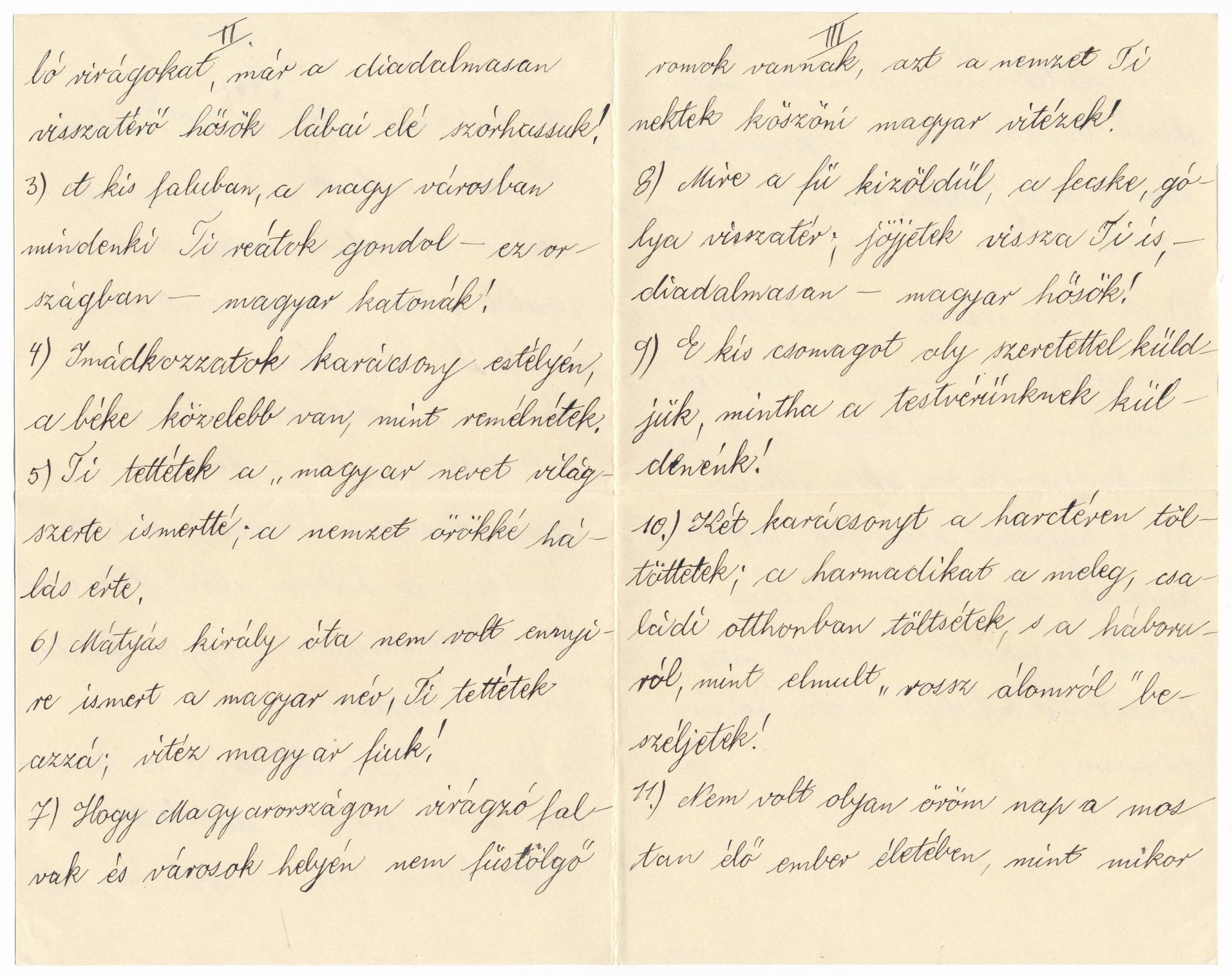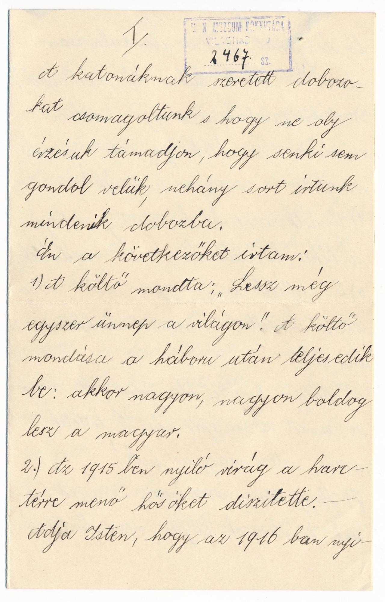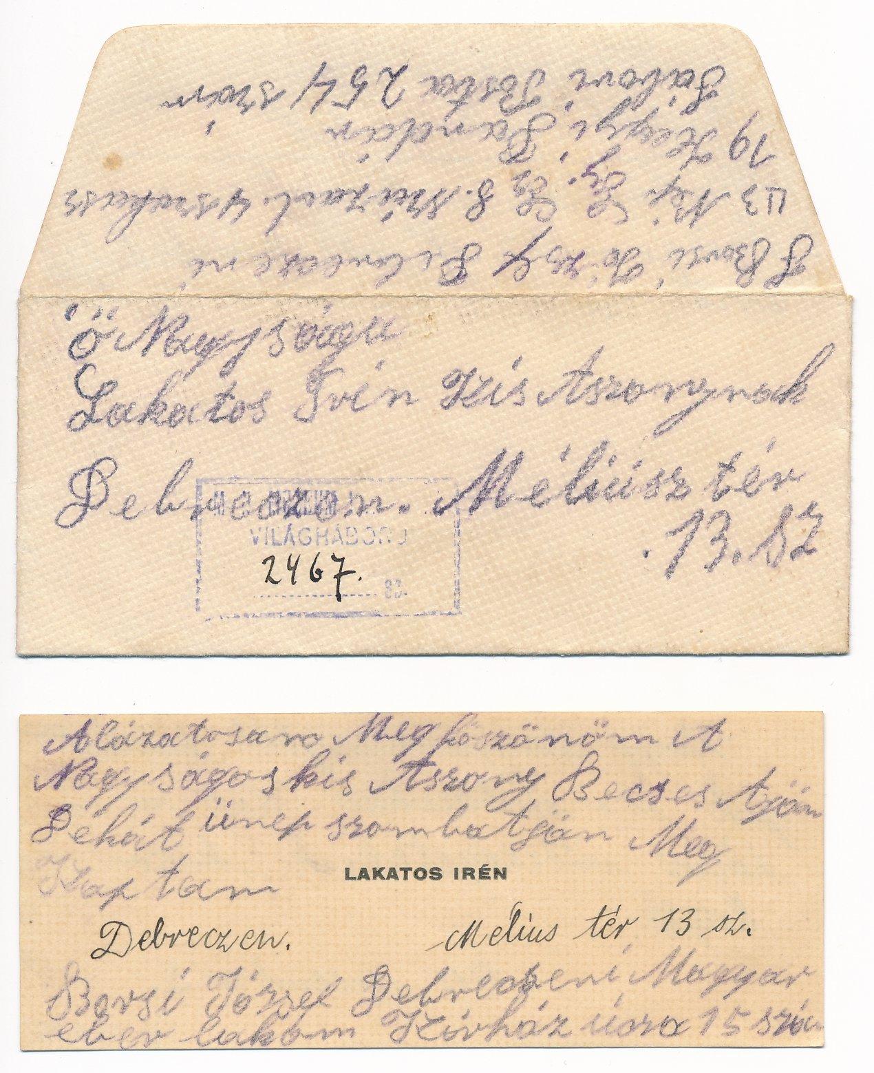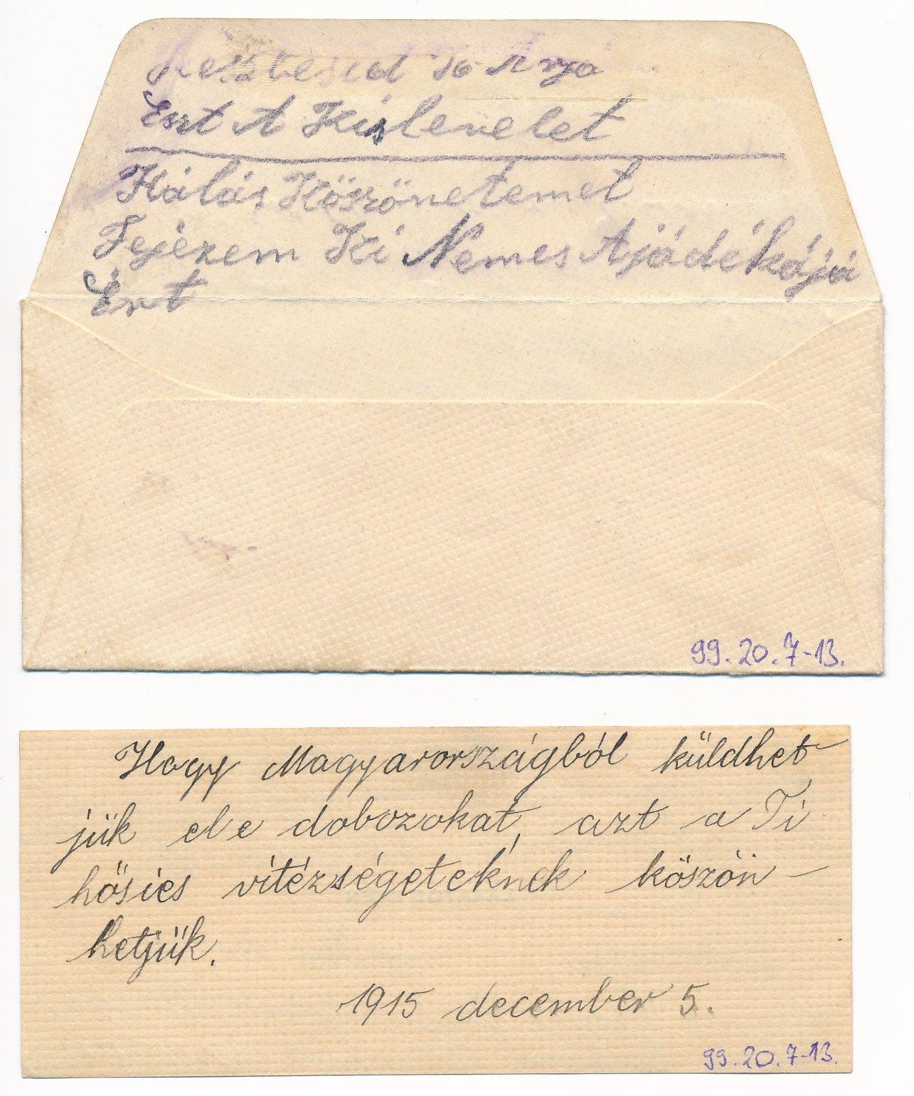 Ezek között található Lakatos Irén debreceni lakos feljegyzése, amit 1915. december elején vetett papírra. Levelében beszámol arról, hogy a karácsony közeledtével szeretetcsomagokat állítottak össze az olasz harctéren szolgáló debreceni „39-eseknek”.