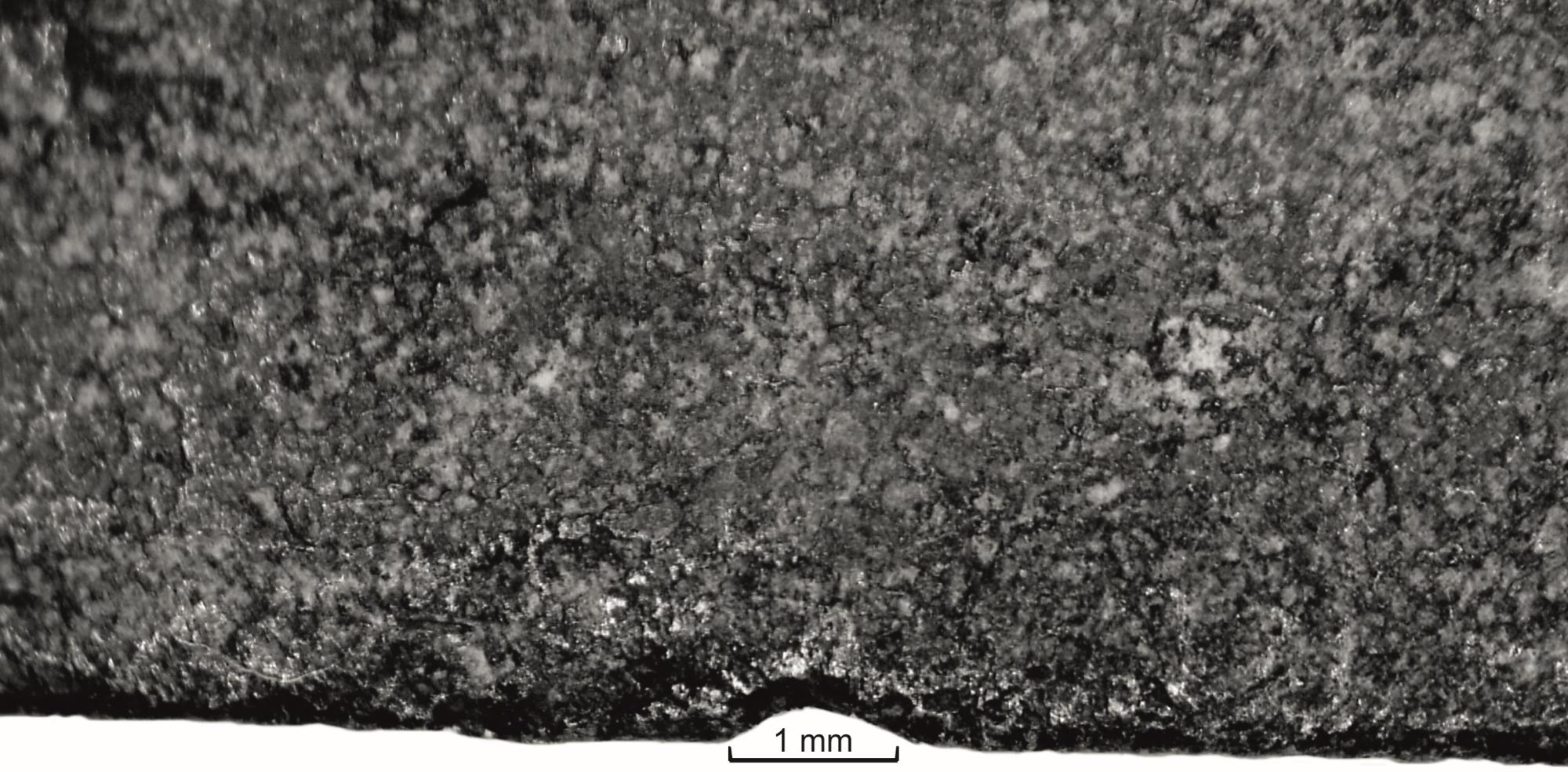 Csorbulásnyom a szervesanyag markolatos Margit-szigeti kardon (Mikroszkóp-felvétel: Tarbay János Gábor).