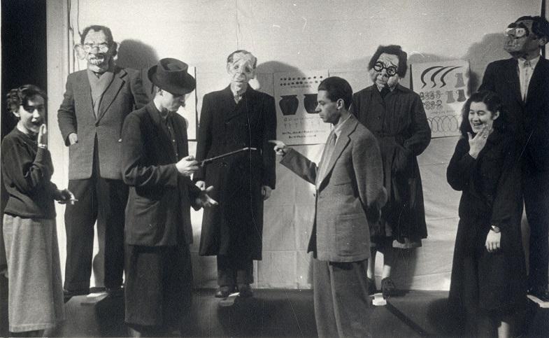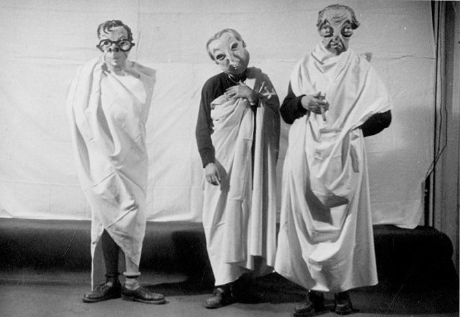 5. kép. 1955 farsangja, balról jobbra a háttérben kezdődően: Vértes maszkjában Bálint B., Török Gyula megjelenítője Mihalik I., Mozsolics Amália szerepében Lenkei Mária, Radnóti "Kutyafülű" Aladárként Vértes László; elől Bikár Fedóra, Trogmayer Ottó, Mócsy András és Sikó Éva.