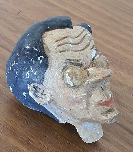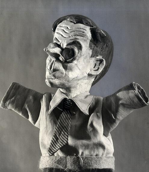 6a-b kép: A Magyar Természettudományi Múzeum egykori főigazgatója, Tasnádi-Kubacska András bábfigurájának feje (ifj. Vértes László tulajdona, Izrael) és a bábu még teljes formájában (1948).