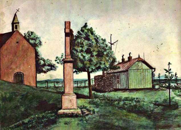 3. kép. A sánc-hegyi kápolna, kőkereszt és a monarchia időszakában épült folyamőr laktanya egy 1918-ból származó festményen.