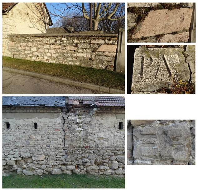 Innen alig néhány méterre, az Önkormányzat udvarával szomszédos melléképület hátfalában és a hozzá kapcsolódó kőkerítésben fedezhetünk fel különböző korokból származó, szemmel láthatóan másodlagosan felhasznált építőanyagot (6. kép). A melléképület lábazatában látható kőanyag talán éppen a közeli Sánc-hegy római romjaiból származik.