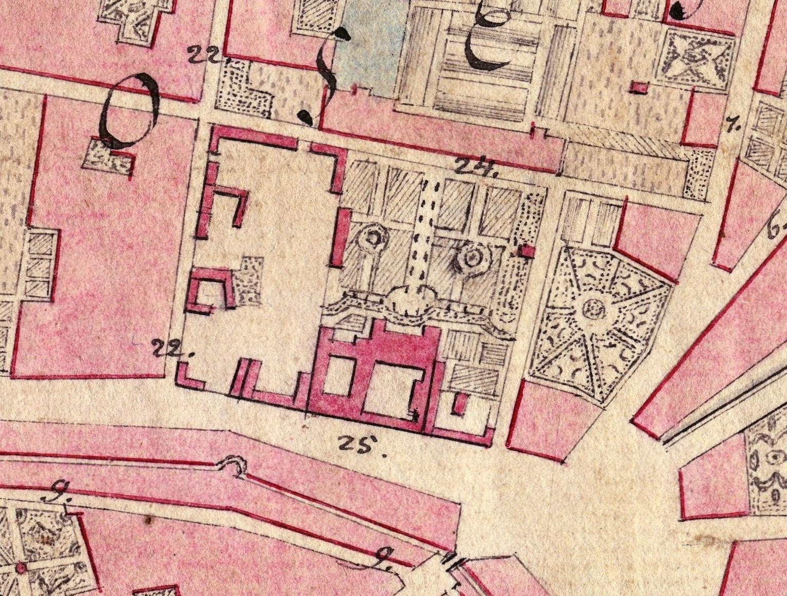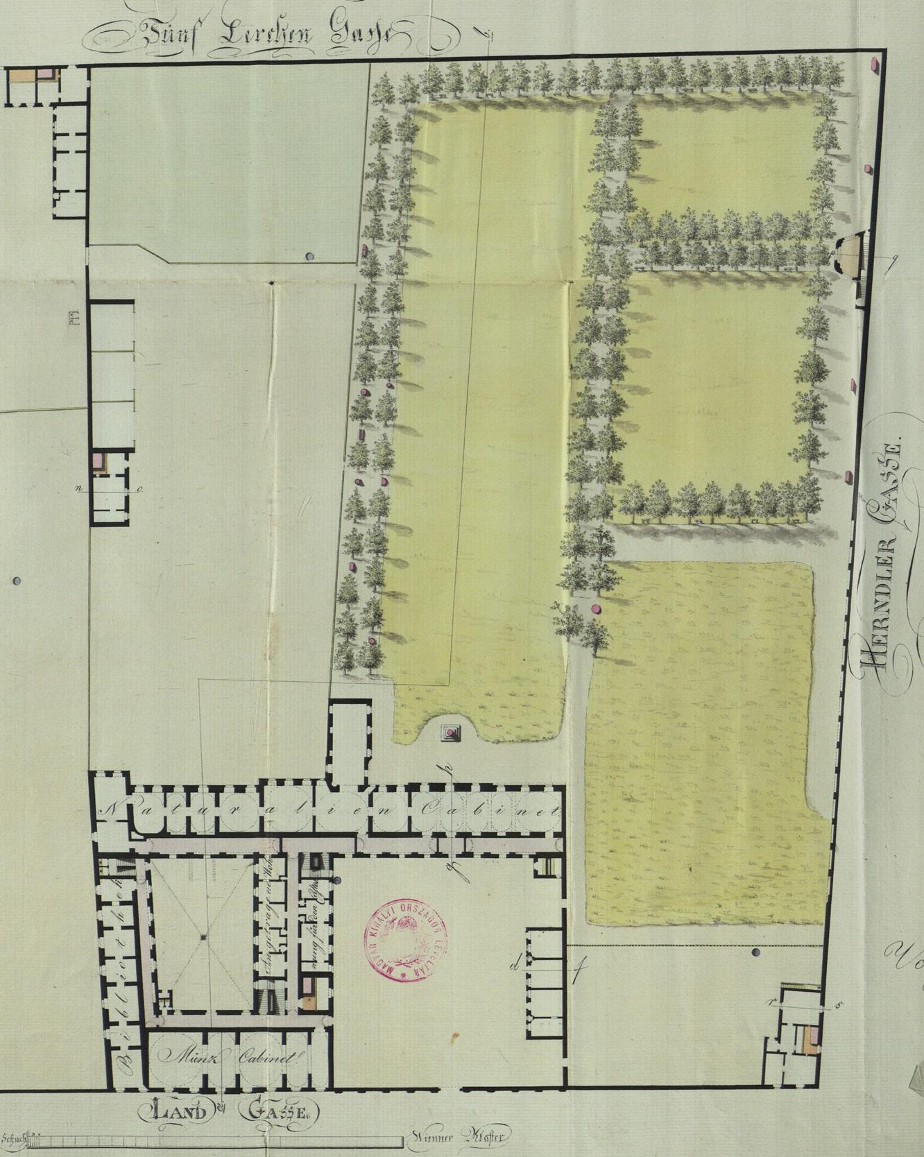 A Magyar Nemzeti Múzeum épülete (a korábbi érseki palota) mögötti kert fasoraival egy 1819-ben készült helyszínrajzon (részlet, MNL Országos Levéltár)
