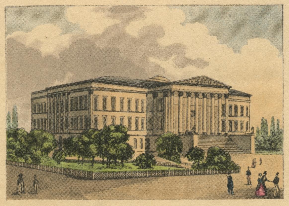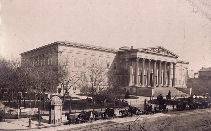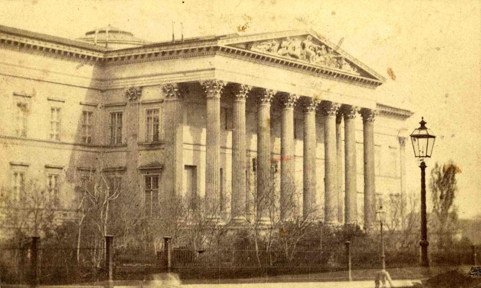 A Nemzeti Múzeum épülete északnyugat felől a homlokzat előtti facsemetékkel, 1865 körül (Magyar Nemzeti Múzeum, Központi Adattár és Digitális Képarchívum). A kép jobb oldalán látható magasabb fa - talán egy jegenye - korábbi telepítésből származik, valószínűleg még a régi múzeumpalota 1838. évi bontása után ültethették.