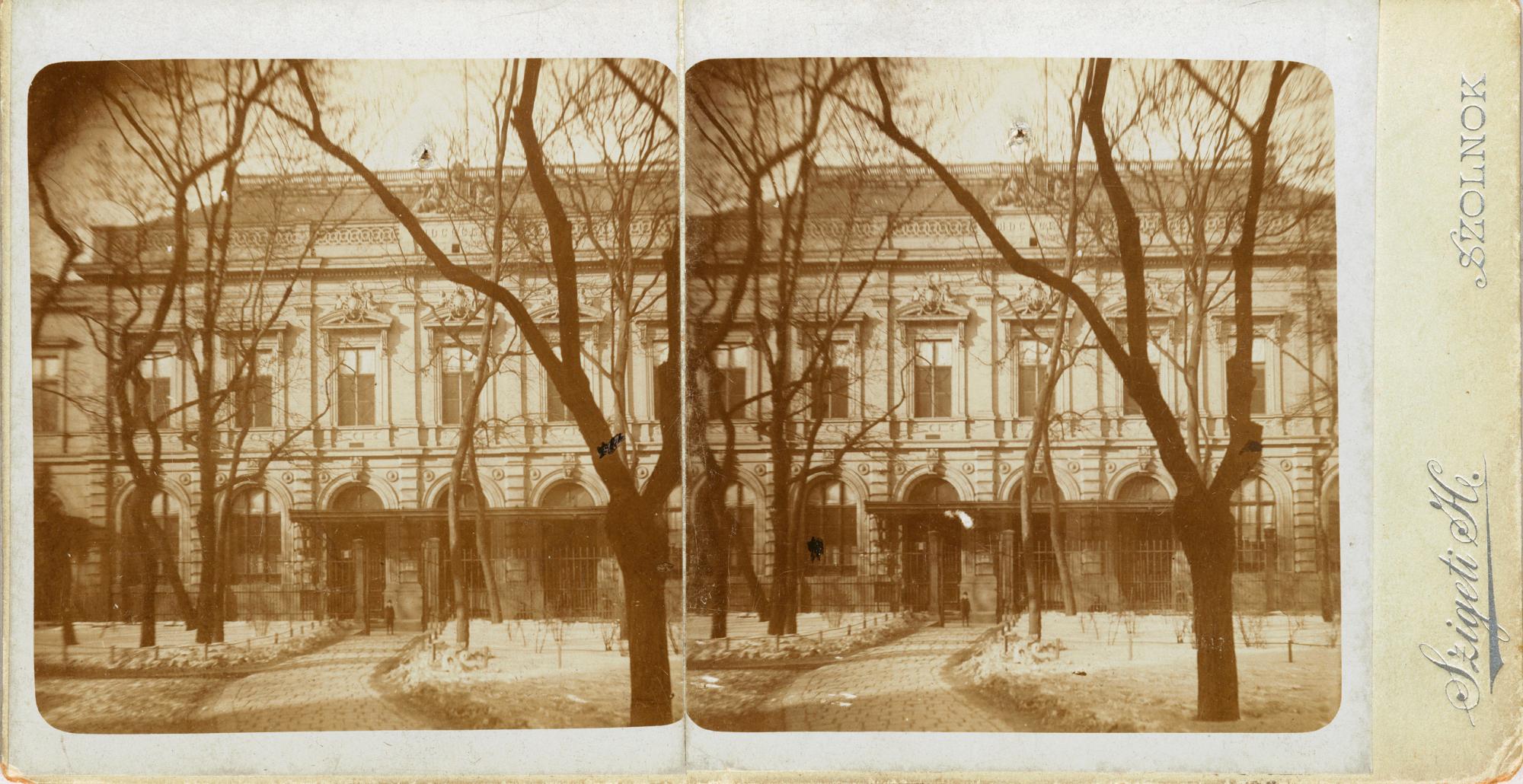 A Múzeumkert északi oldala, a Régi Képviselőház (ma: Olasz Intézet) előtti része az első faültetésből származó fákkal (sztereókép, MNM Történeti Fényképtár)