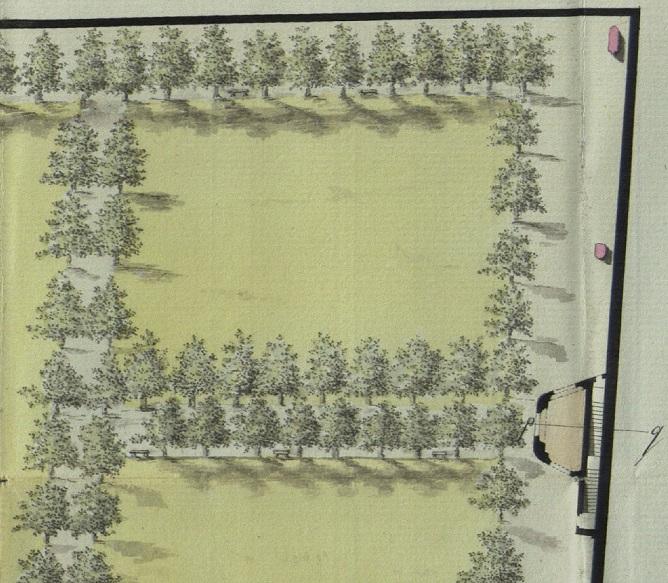 A múzeumtelek (a korábbi érseki kert) helyszínrajza 1819-ből, melyen fel-feltűnnek padok is (részlet, MNL Országos Levéltár)