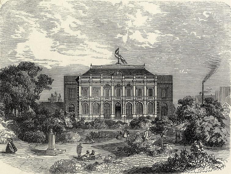 A Családi Kör 1865/44. számához fénykép után készült metszet a Sándor utcai Képviselőházról, 1865 (MNM Történelmi Képcsarnok) E képen ábrázolták először a múzeumkerti padot. Ekkor már legalább 20 db volt a kertben.