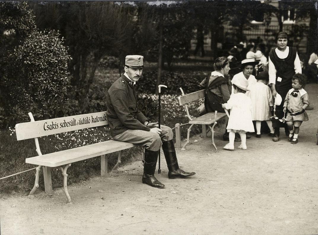 Az I. világháborús katonáknak felállított pad a Múzeumkertben, 1915 (BTM Kiscelli Múzeum – Müllner János felvétele)