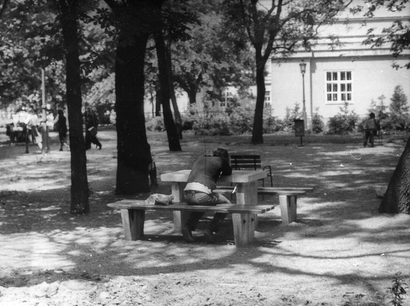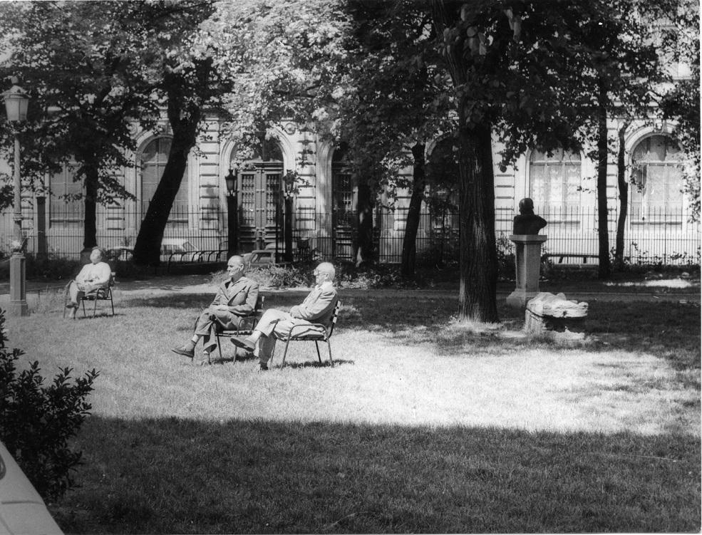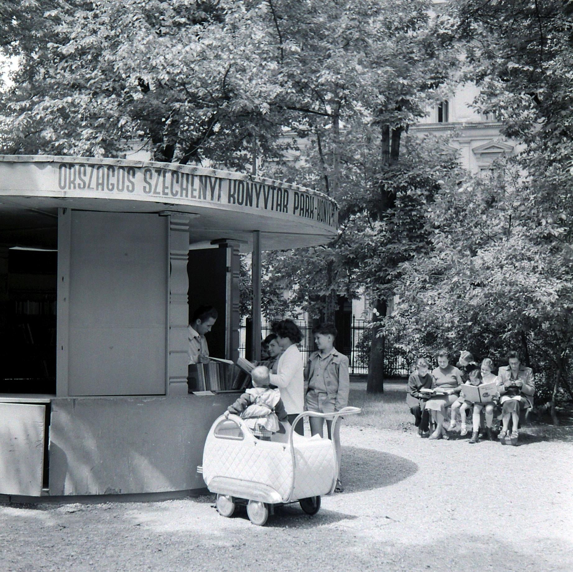 A múzeumkerti Park-könyvtár, közelében az olvasók padjával, 1955 (MNM Történeti Fényképtár)