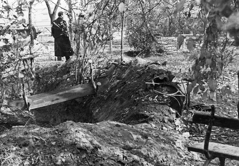 A régi kerti padok és székek 1956-ban a Múzeumkertben ásott lövészárkok elé kerültek fedezékként funkcionálva (MNM Központi Adattár)