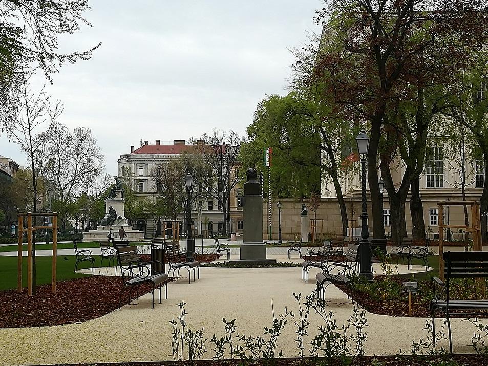 A megújult Múzeumkert új Buchwald-típusú kerti bútoraival 2019 áprilisában (a Múzeum utca felől, Debreczeni-Droppán Béla felvétele)