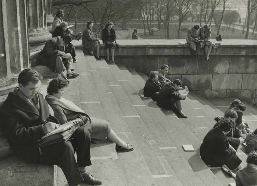 A múzeumlépcső a 20. század második felében (és tovább…) a fiatalság kedvelt pihenő- és tanulóhelyévé vált (MNM Történeti Fényképtár)
