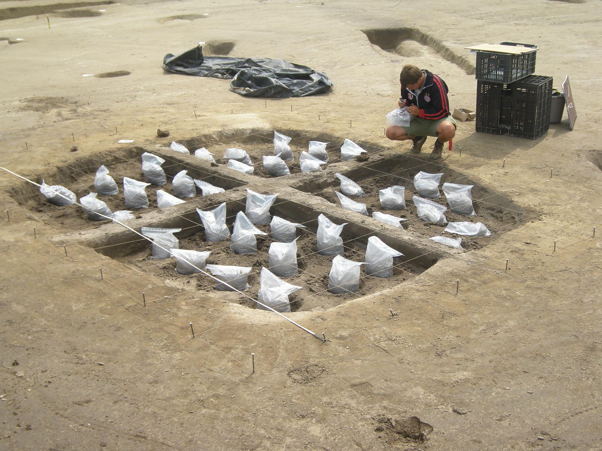 A térhasználat elemzésére Győr–Ménfőcsanak határában épülő bevásárlóközpont munkálatait megelőző régészeti feltárás során Széles-földek lelőhelyen feltárt épületeket választottunk ki, azok belső terét a felületükre vetítette 50x50 cm-es kvadrátokban mintáztuk meg (1. kép).