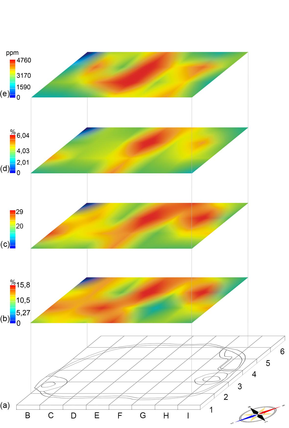 Az objektumok anyagában megtalált és meghatározott mikro- és makroszkopikus növényi maradványok arra utalnak, hogy az építmények belső terében nagy mennyiségű gabonaanyag (szár, levél, pelyvalevelek, kalászorsó töredékek, gabonaszem töredékek stb.) került felhalmozásra. Ezt az elképzelést erősíti az ún. talajtani paraméterek eloszlása is az épület belső terében (2. kép). Az objektumok felszínére vetített eloszlástérképek együttes értelmezése, valamint az adatok statisztikai kiértékelése lehetővé tette a belső tér használatára vonatkozó elméletek felállítását.