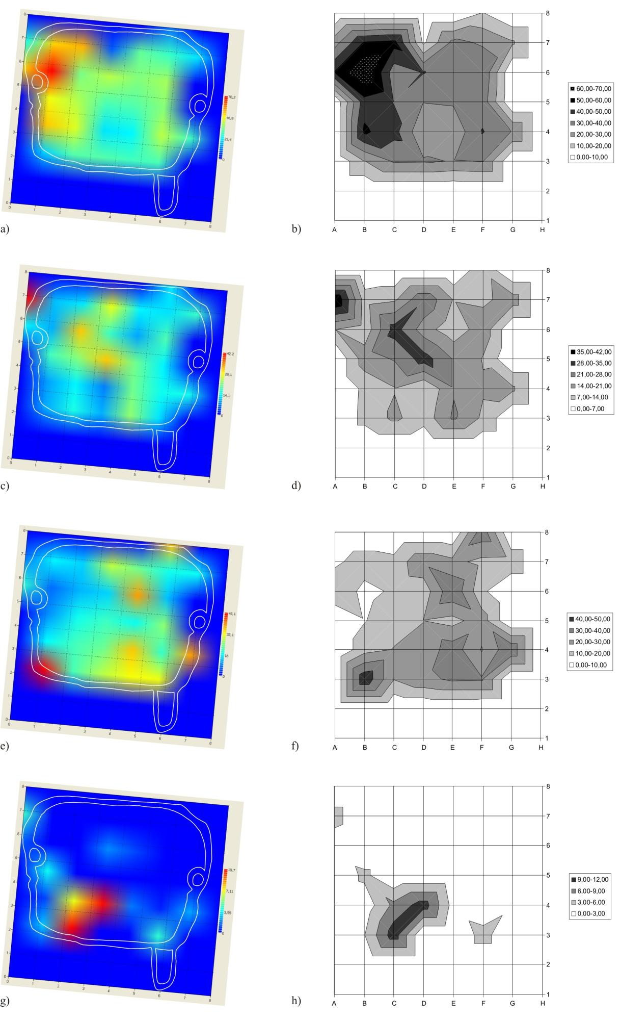2. kép: A vizsgált épület alaprajza (a), illetve az alaprajzra vetített (b) CaCO3% eloszlástérképe, (c) Arany-féle kötöttségi érték eloszlástérképe, (d) TOC% eloszlástérképe, illetve Ptotal eloszlástérképe. Az itt bemutatott talajtani paraméterek eloszlástérképei közül az ún. szerves szén (TOC%), illetve összes foszfortartalom (Ptotal) az, amelyek direkt módon jelölik a magasabb szervesanyag tartalmú belső térrészleteket (két legfelső hőtérkép). Ezekről jól leolvasható, hogy az épület belsejében az élettevékenységek elsődlegesen az épület középső részére koncentrálódtak (kiemelkedő piros szigetek).