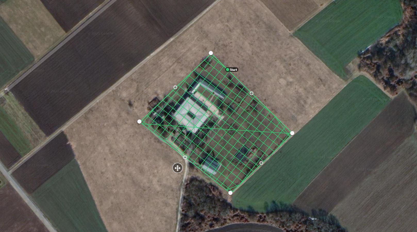 A Római Birodalom alatt virágzó balácai villagazdaság (Kr.u. 1-4. század) rekonstrukciójához a központi épületegyüttest és szűk környezetét lefedő háromdimenziós alapállományra van szükség. Ennek elkészítéséhez a leghatékonyabb eszköz egy drón volt. A felmérést és az adatok feldolgozását a Magyar Nemzeti Múzeum Régészeti Örökségvédelmi Igazgatóságának Geodéziai és Térinformatikai csoportja végezte Matrice 600 eszközzel. Leegyszerűsítve és összefoglalva a munkafolyamatot, a drónnal végigfényképeztük a bemutatóhely területét, majd a képeket feldolgozva hoztuk létre a háromdimenziós modellt. A pontos és részletgazdag felméréshez, ami nélkülözhetetlen az élethű látogatói élmény létrehozásához, a drón repülési útvonalát és a fényképezés ütemezését pontosan meg kellett tervezni. Az általunk használt drónokhoz kifejlesztett útvonaltervező szoftvert használva ezért első lépésként meghatároztuk a felmérendő terület határvonalait, valamint, megterveztük a repülési útvonalat úgy, hogy az elkészülő fotók között hosszanti és keresztirányban is legalább 70%-os átfedés legyen. Ez utóbbira a képek későbbi 3D feldolgozása miatt van szükség, amiről később fogok szót ejteni. A terület nagysága, az általunk használt kamera látószöge, a drón repülési magassága és a fényképek átfedésének százaléka megadja, hogy a drónnak milyen útvonalat kell bejárnia a felvételezés során (1. ábra).