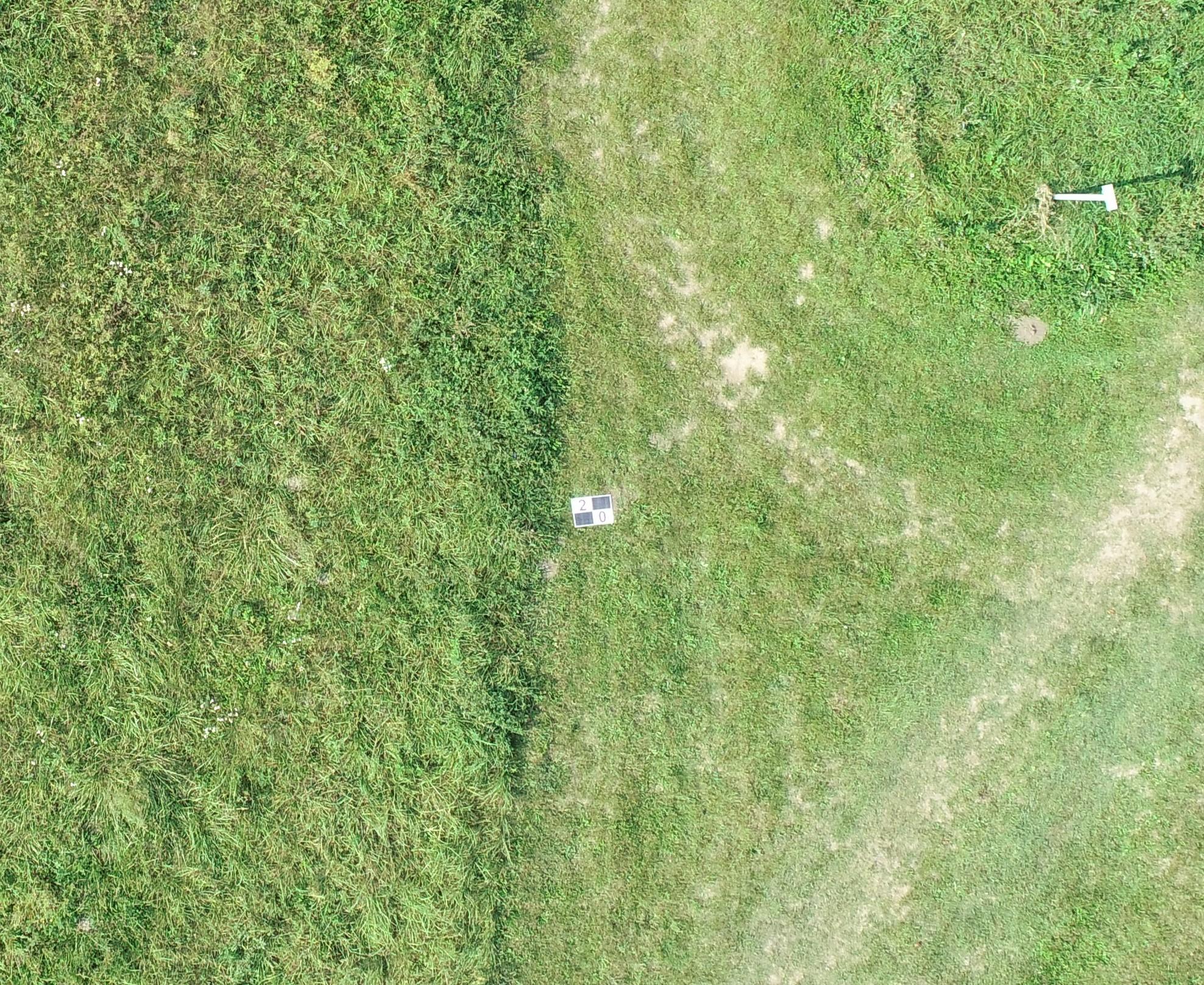 2. ábra: Az általunk használt egyik illesztőpont a villagazdaság melletti füves területen kitűzve, rajta az azonosításhoz szükséges számmal.