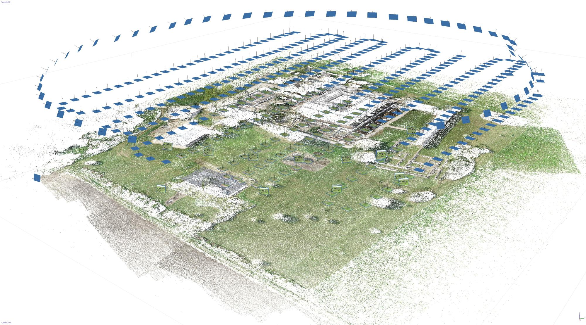 A repülés során 441 darab fénykép készült a villagazdaság magterületéről. Ezt követően a felvételek fotogrammetriai feldolgozása során a kétdimenziós képekből összeállt a 3D modell. A folyamat a „structure from motion” elvre épül, aminek lényege az azonos pontok automatizált felismerése és térbeli pozíciójának meghatározása. Ez utóbbi lépést azt teszi lehetővé, hogy a különböző fotókon ugyanazon pont eltérő szögből és távolságból látszik, s ezen értékek segítségével meghatározható a térben elfoglalt helye. Vagyis nagyon leegyszerűsítve, a számítógépes program az ember térlátásához hasonlóan működik.