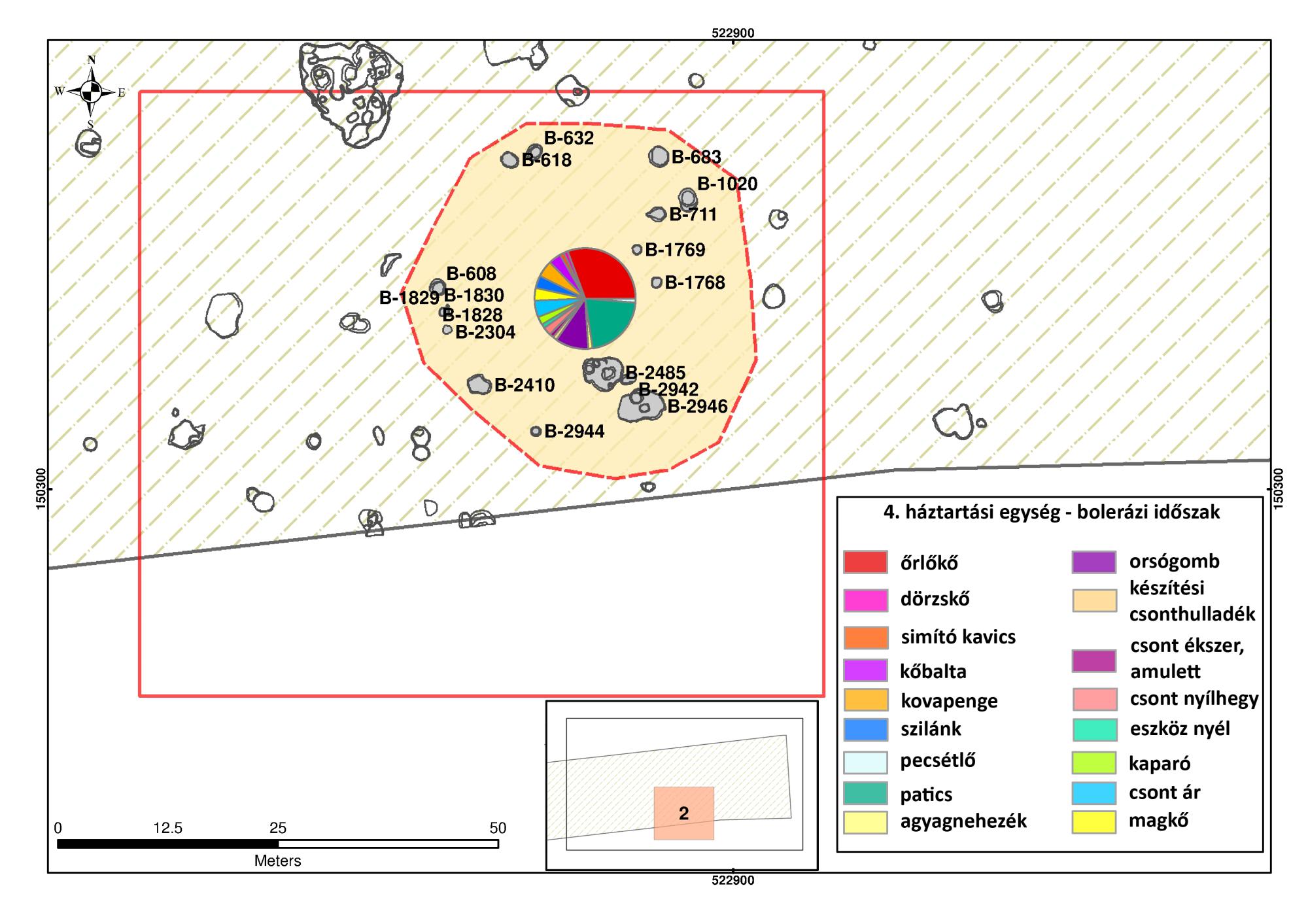 4. kép: Régészeti leletek megoszlása a késő rézkori objektumokban egy feltételezett háztartási egységen belül Balatonkeresztúr Réti-dűlő lelőhelyen