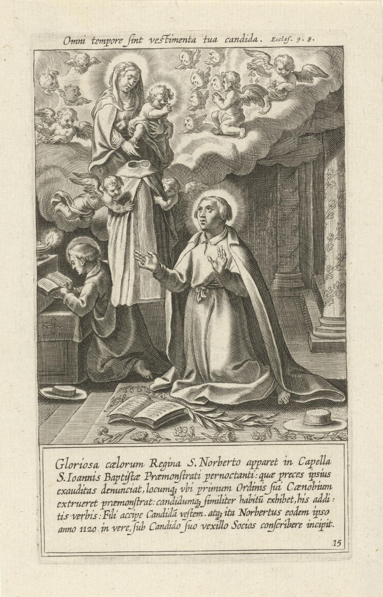1. kép: Szűz Mária átnyújtja Szent Norbertnek a fehér szerzetesi habitust. Cornelis Galle metszete Joannes Chrysostomus van der Sterre Vita S. Norberti című kötetében (Antwerpen, 1622). Fotó: Rijksmuseum