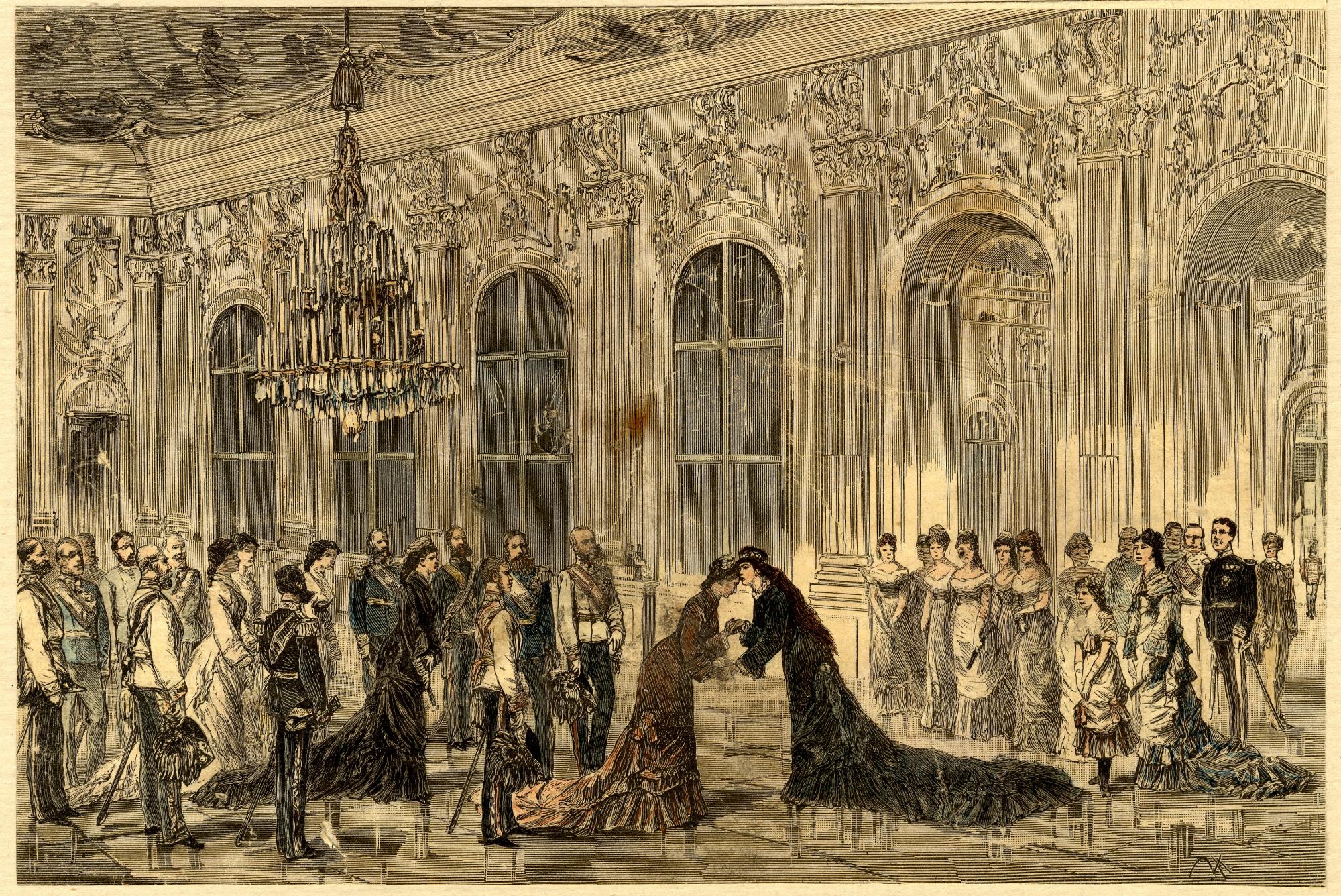 Erzsébet királyné fogadja Rudolf trónörökös menyasszonyát, Stefániát a schönbrunni kastélyban, 1881. május. MNM Történelmi Képcsarnok, leltári szám: 56.1332.